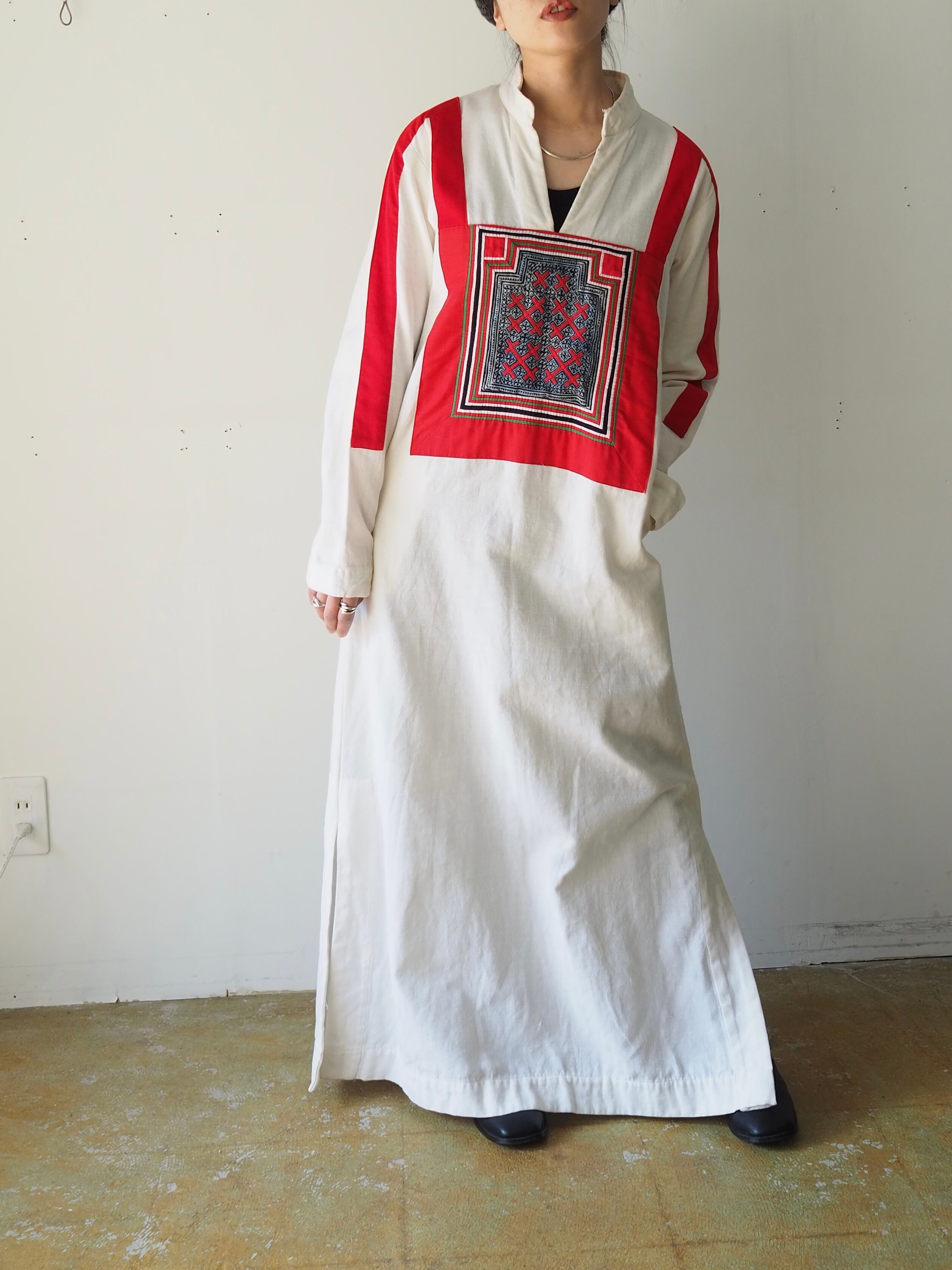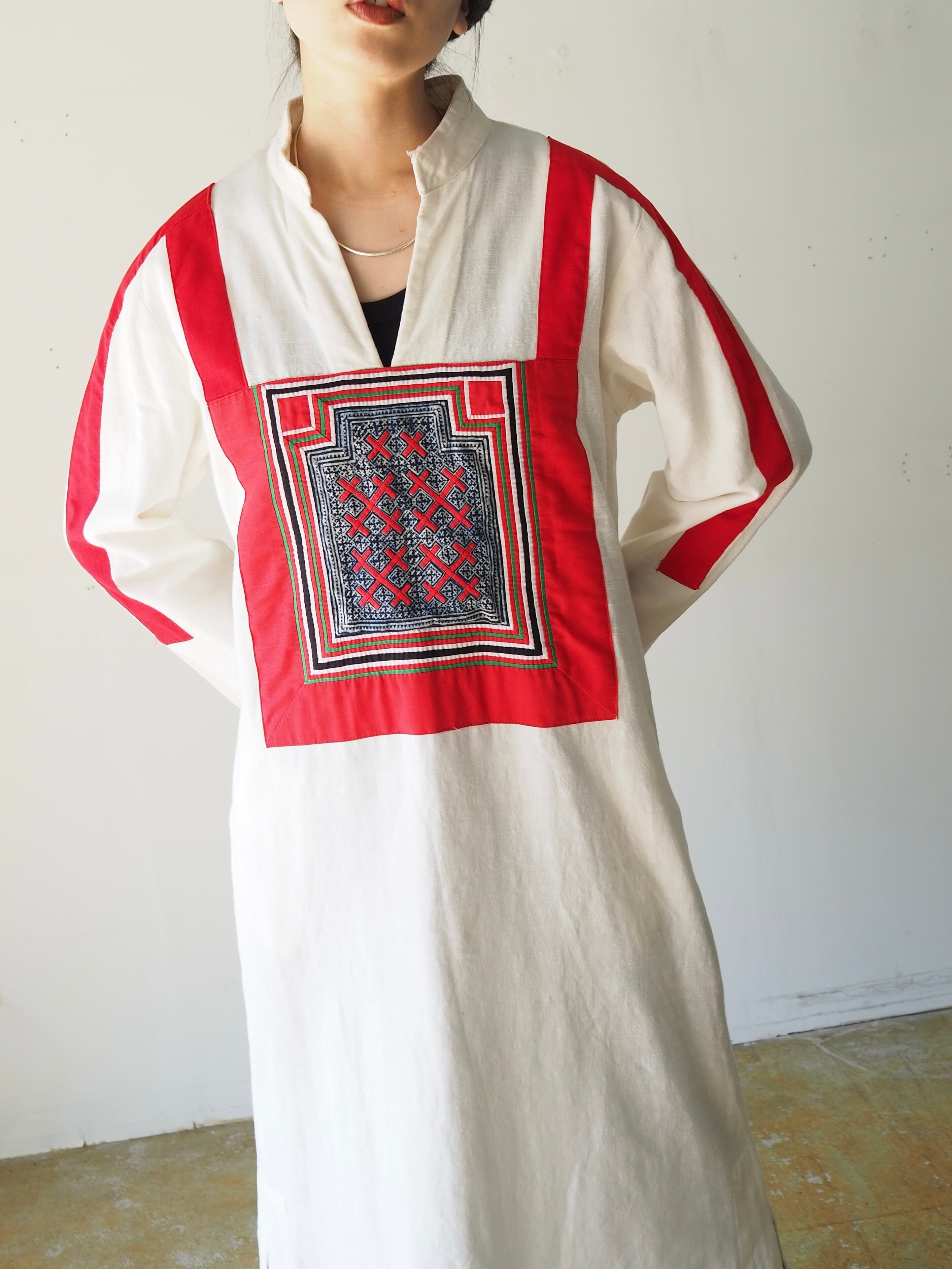 裾まですとんと直線的なパターンで作られたロングドレス。