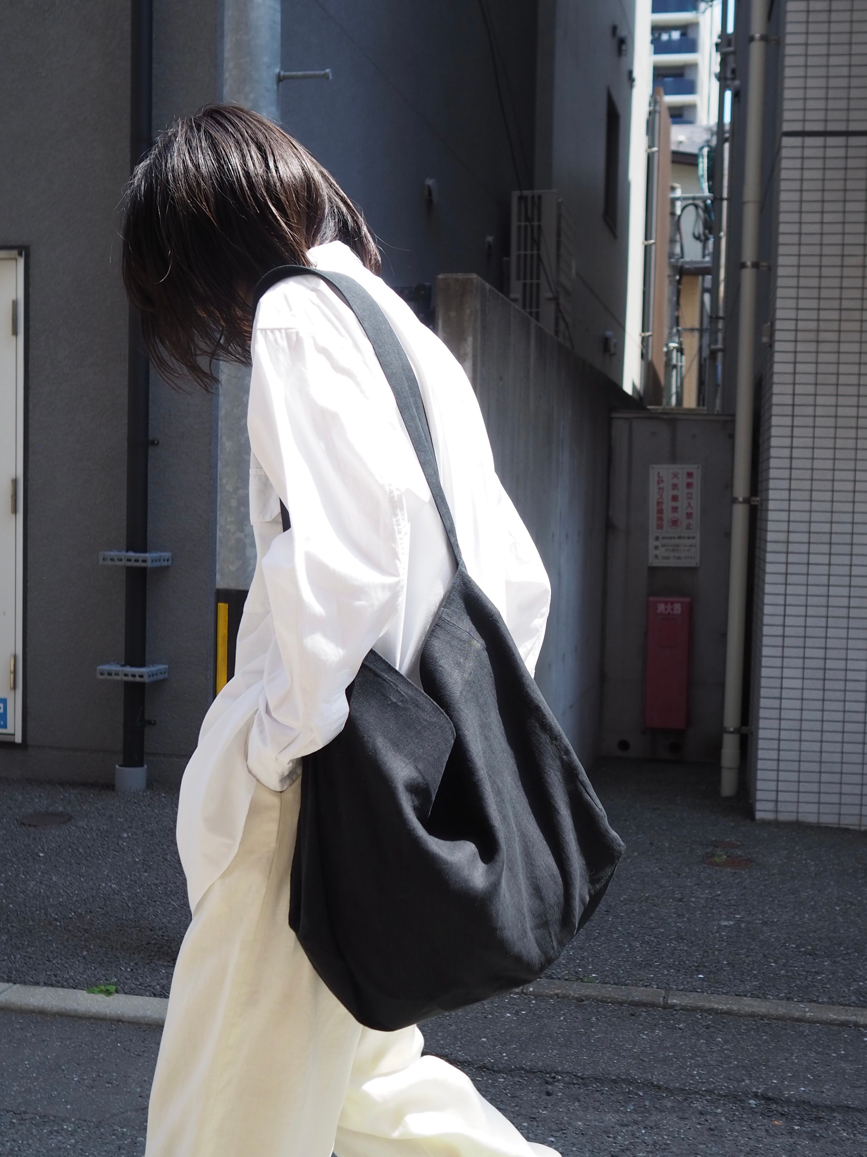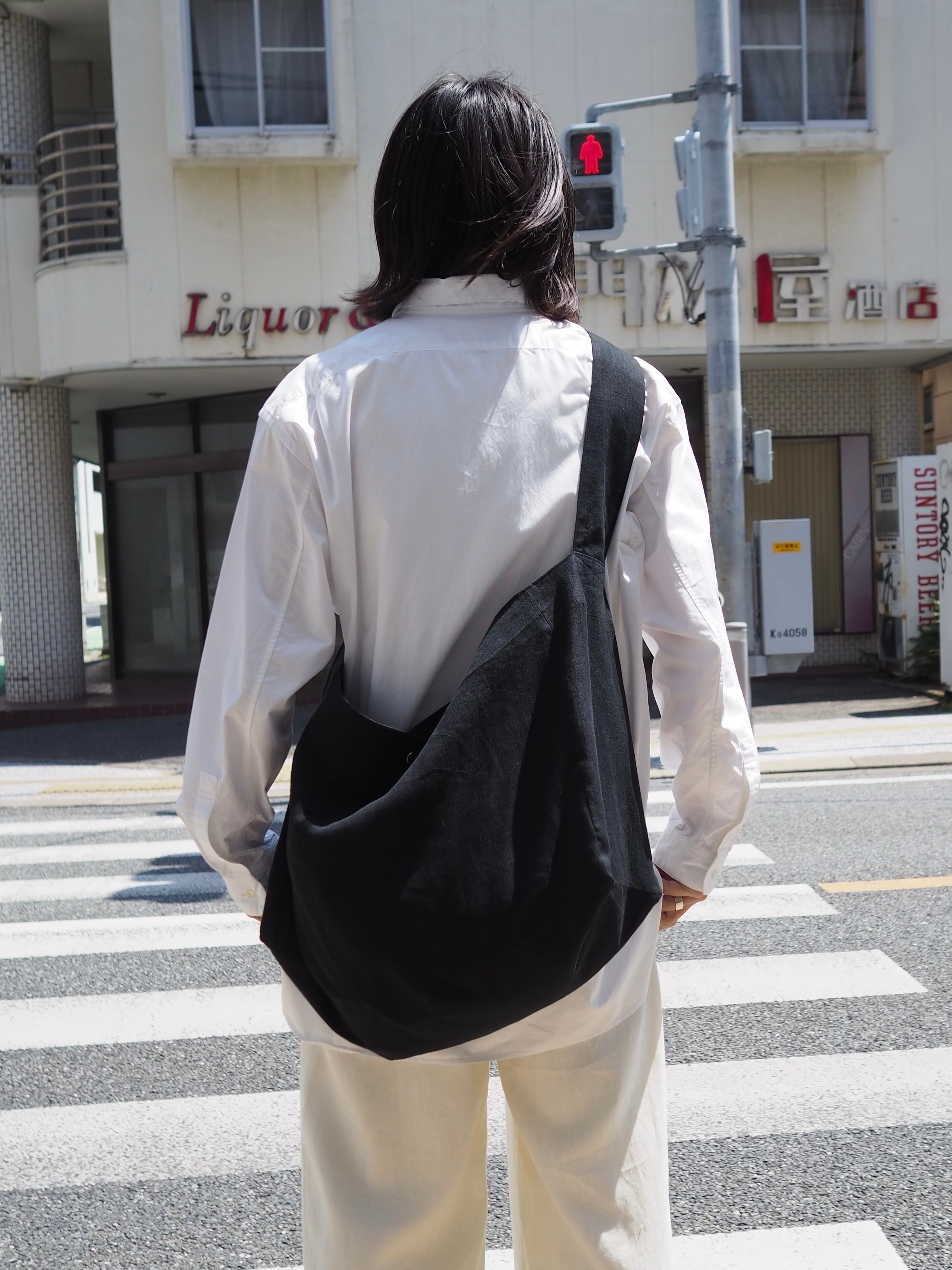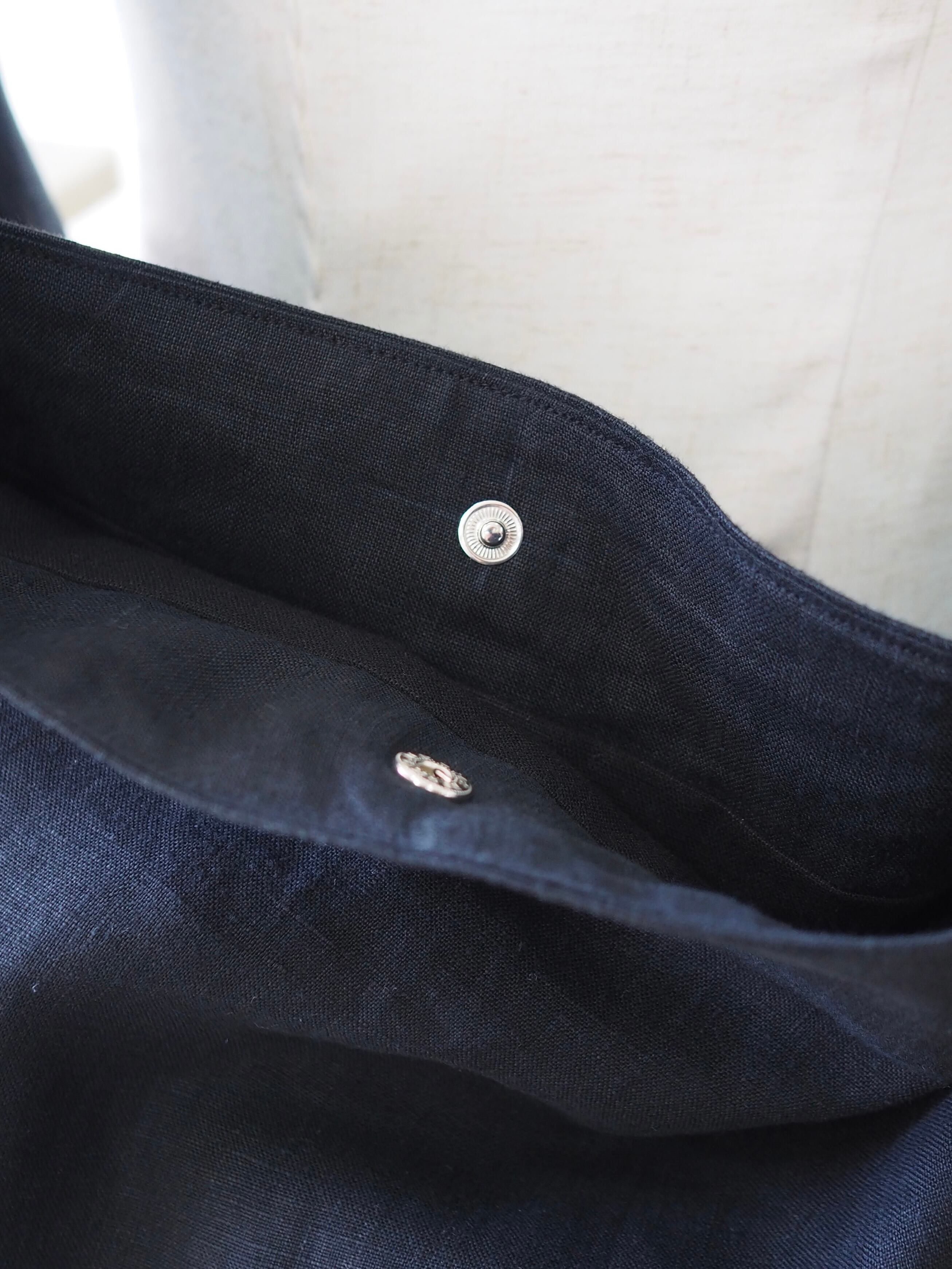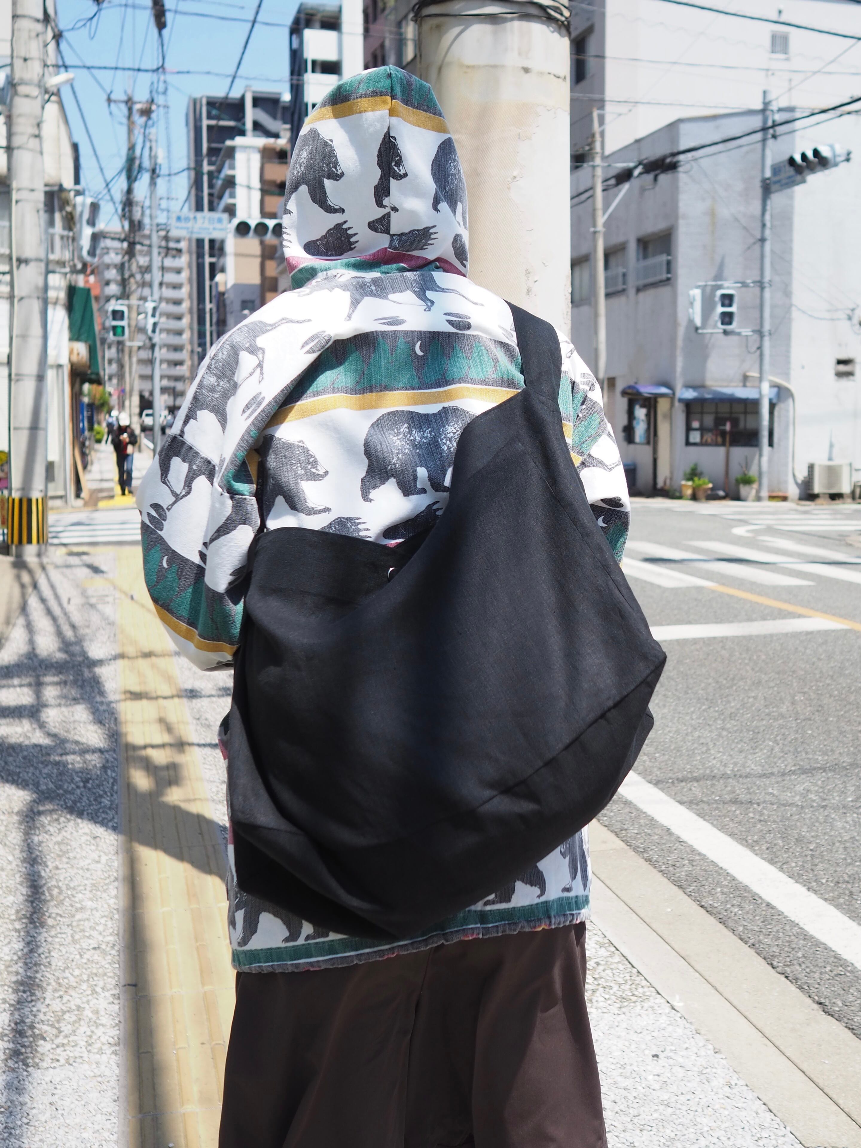 ここ最近、古着で定番のニュースペーパーバッグが妙に気になってたんですが、自分達のスタイルには絶対にハマらないので黒リネン生地でアップデート。