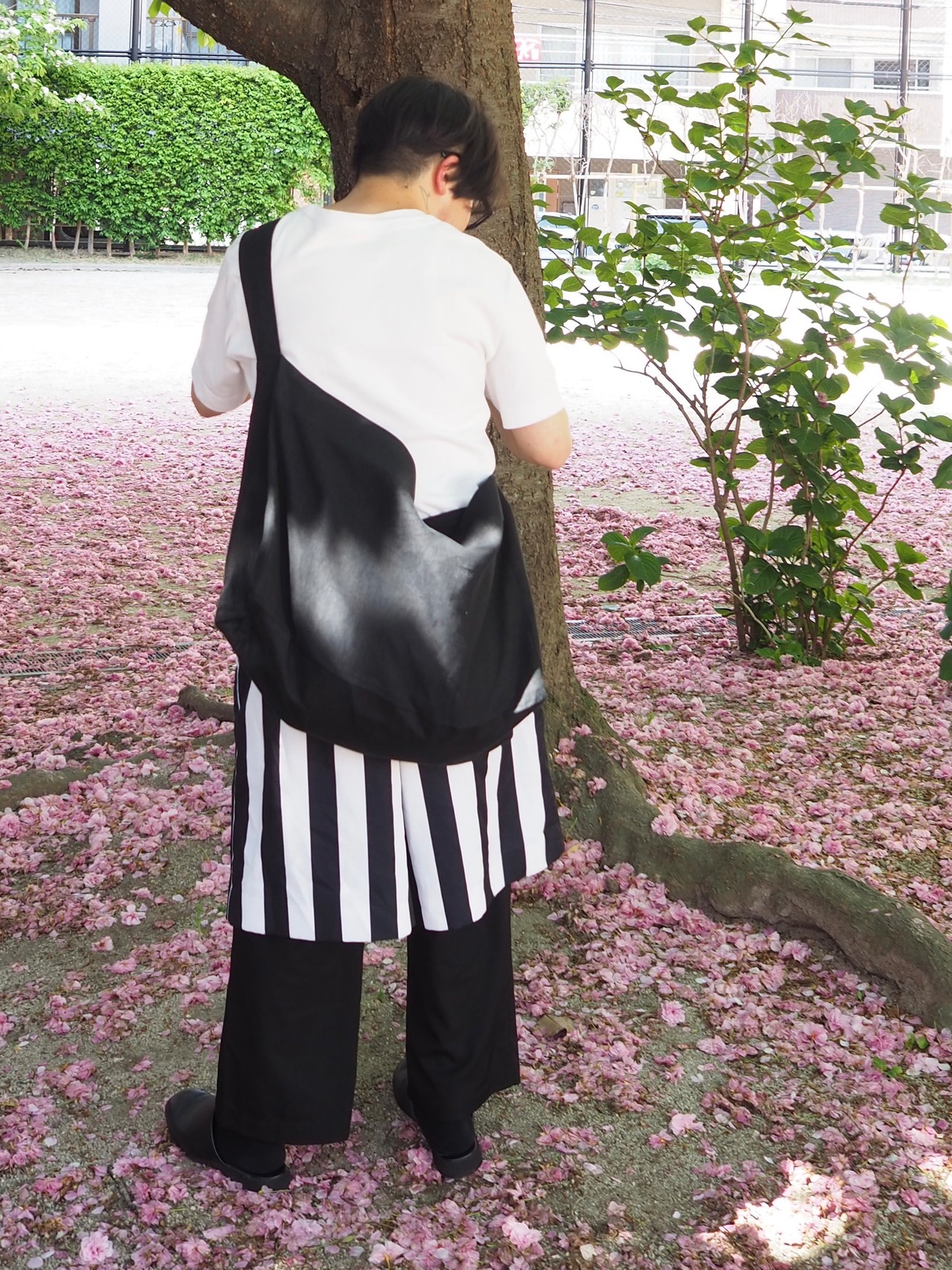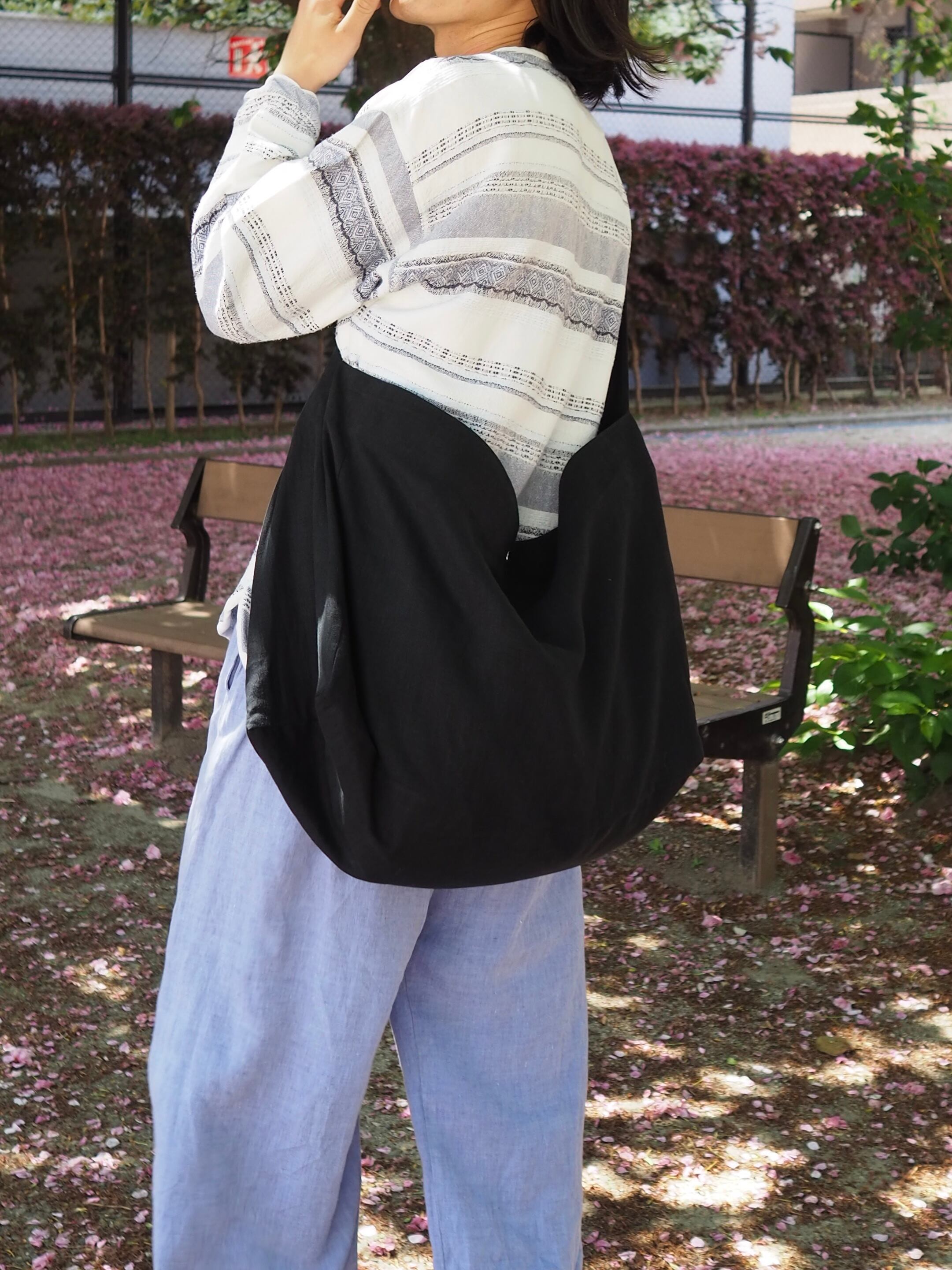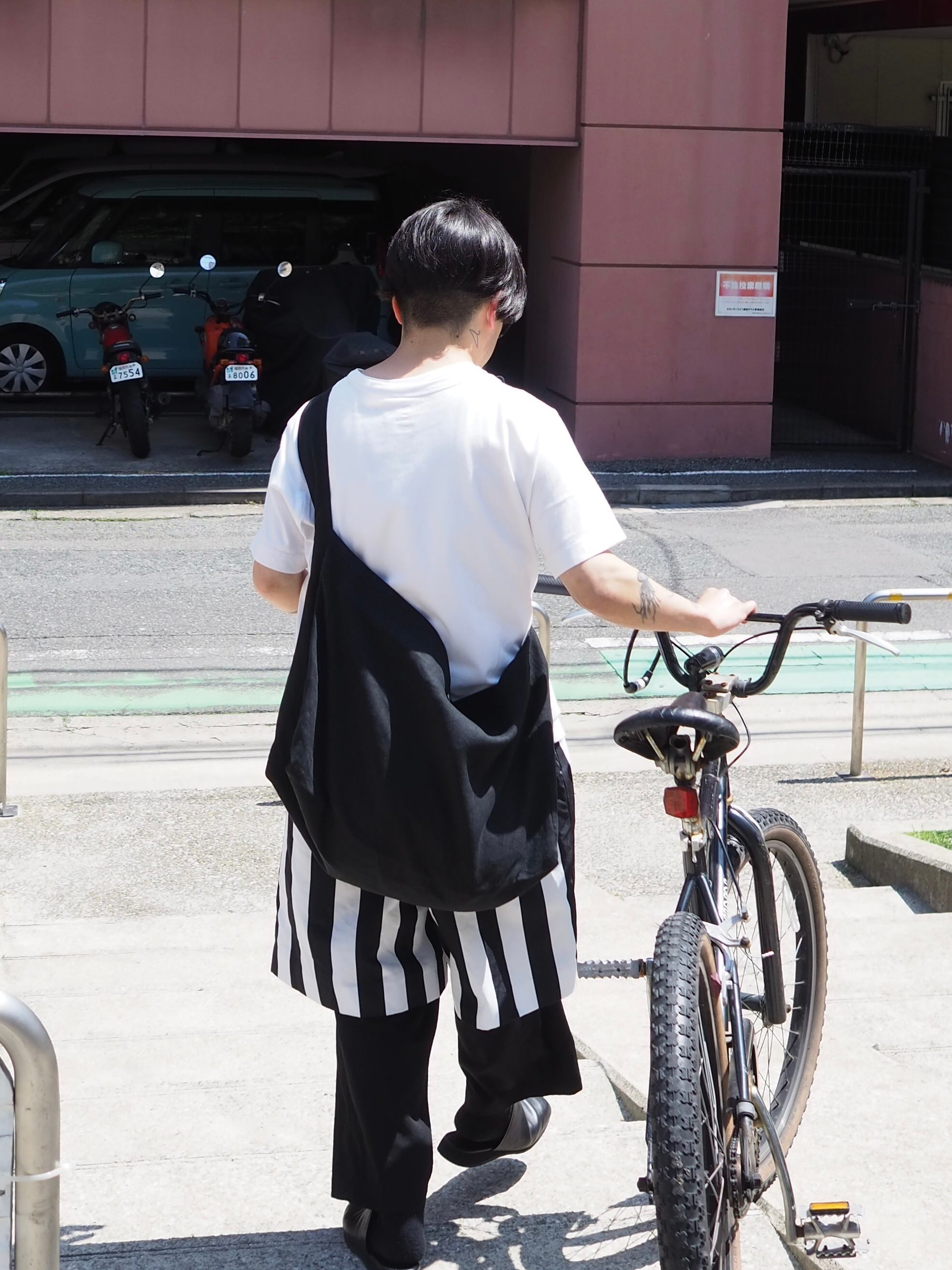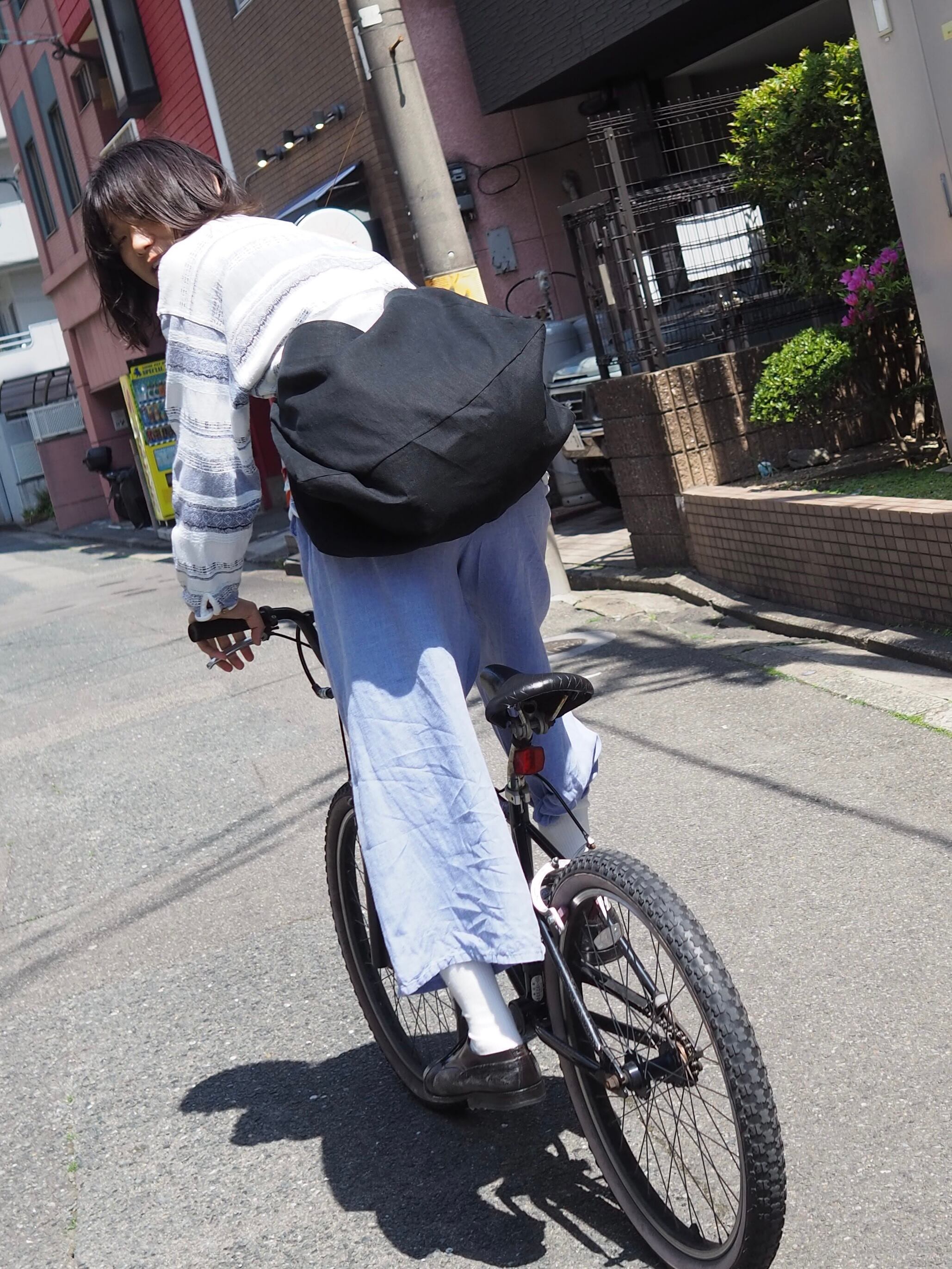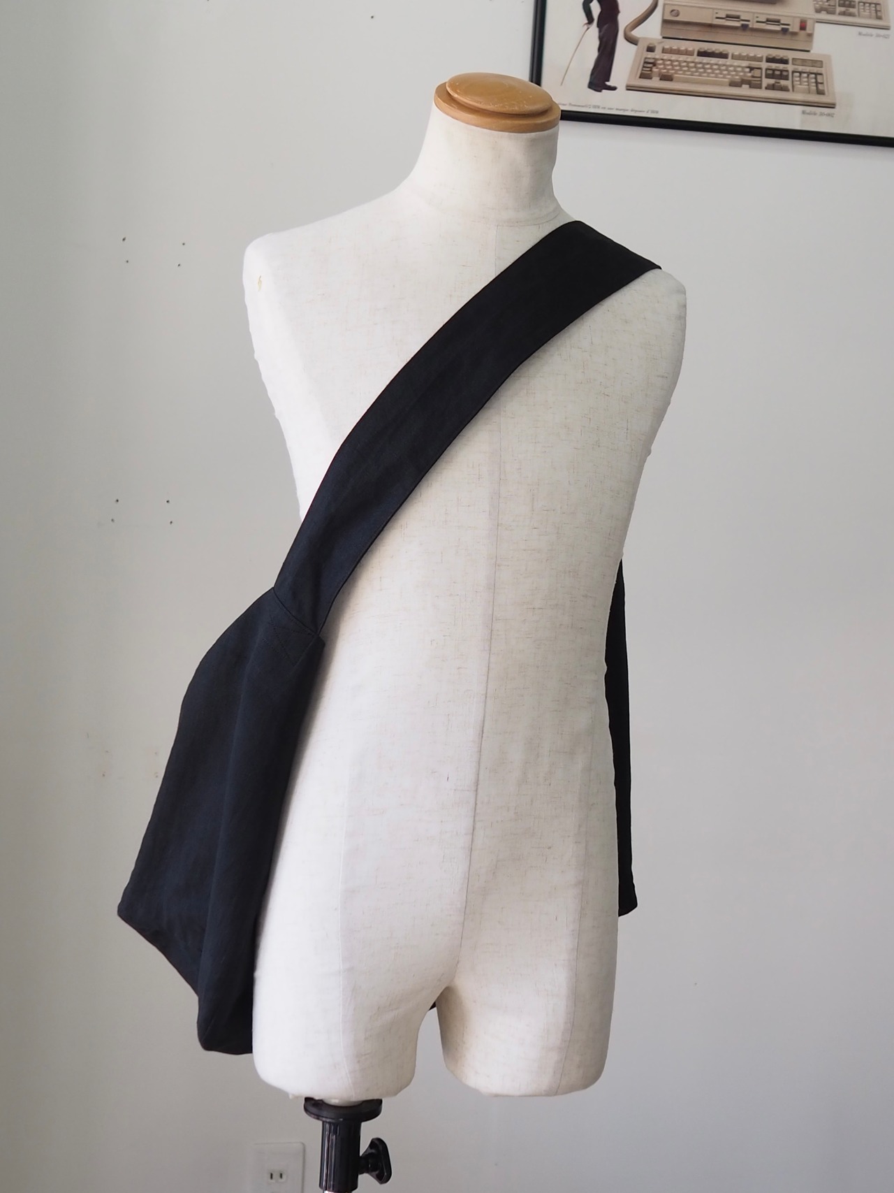 ここ最近、古着で定番のニュースペーパーバッグが妙に気になってたんですが、自分達のスタイルには絶対にハマらないので黒リネン生地でアップデート。