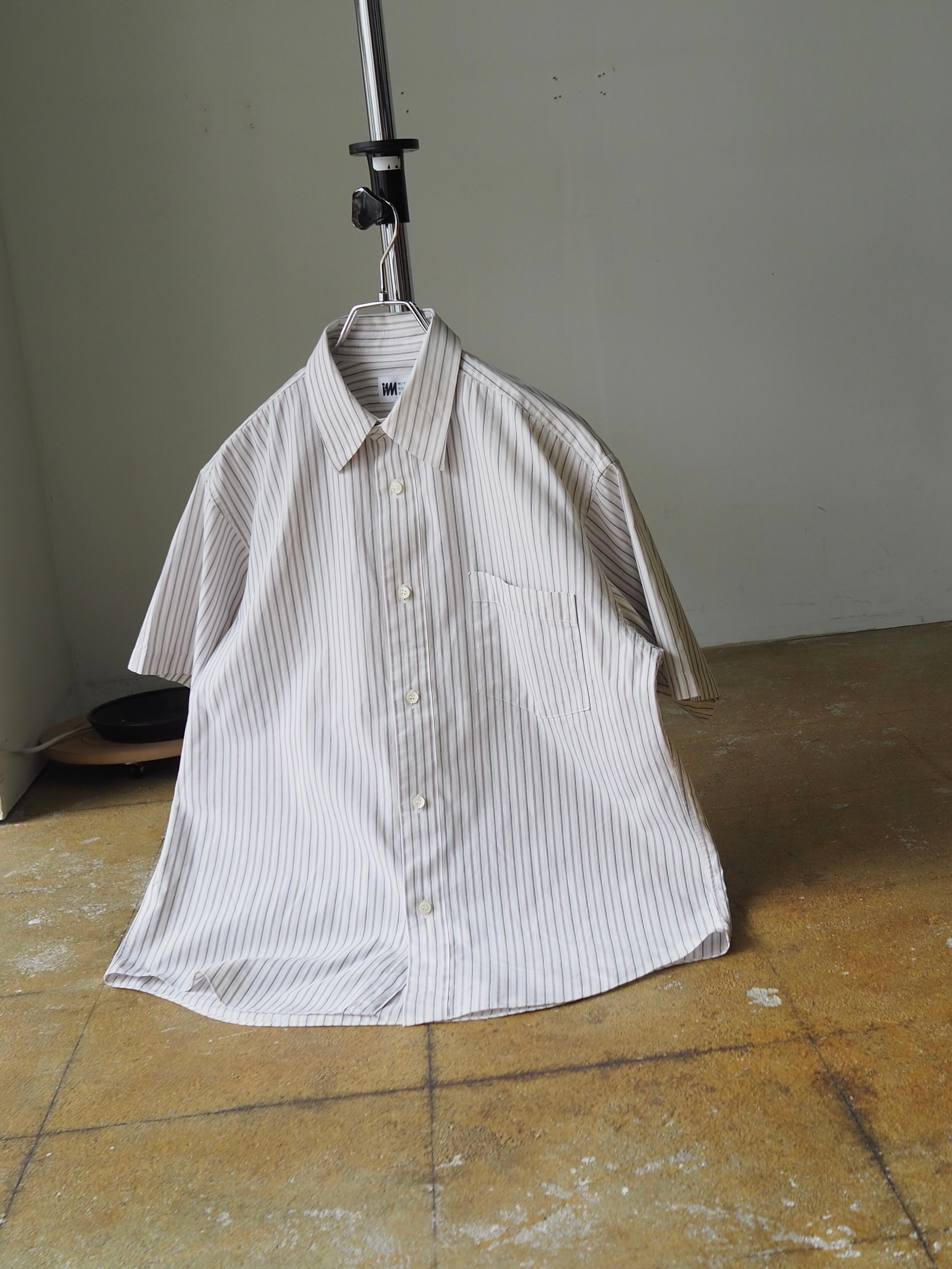 白のコットンベースにランダムな織りのストライプが入り、イッセイミヤケらしい背面のタックの入り方。