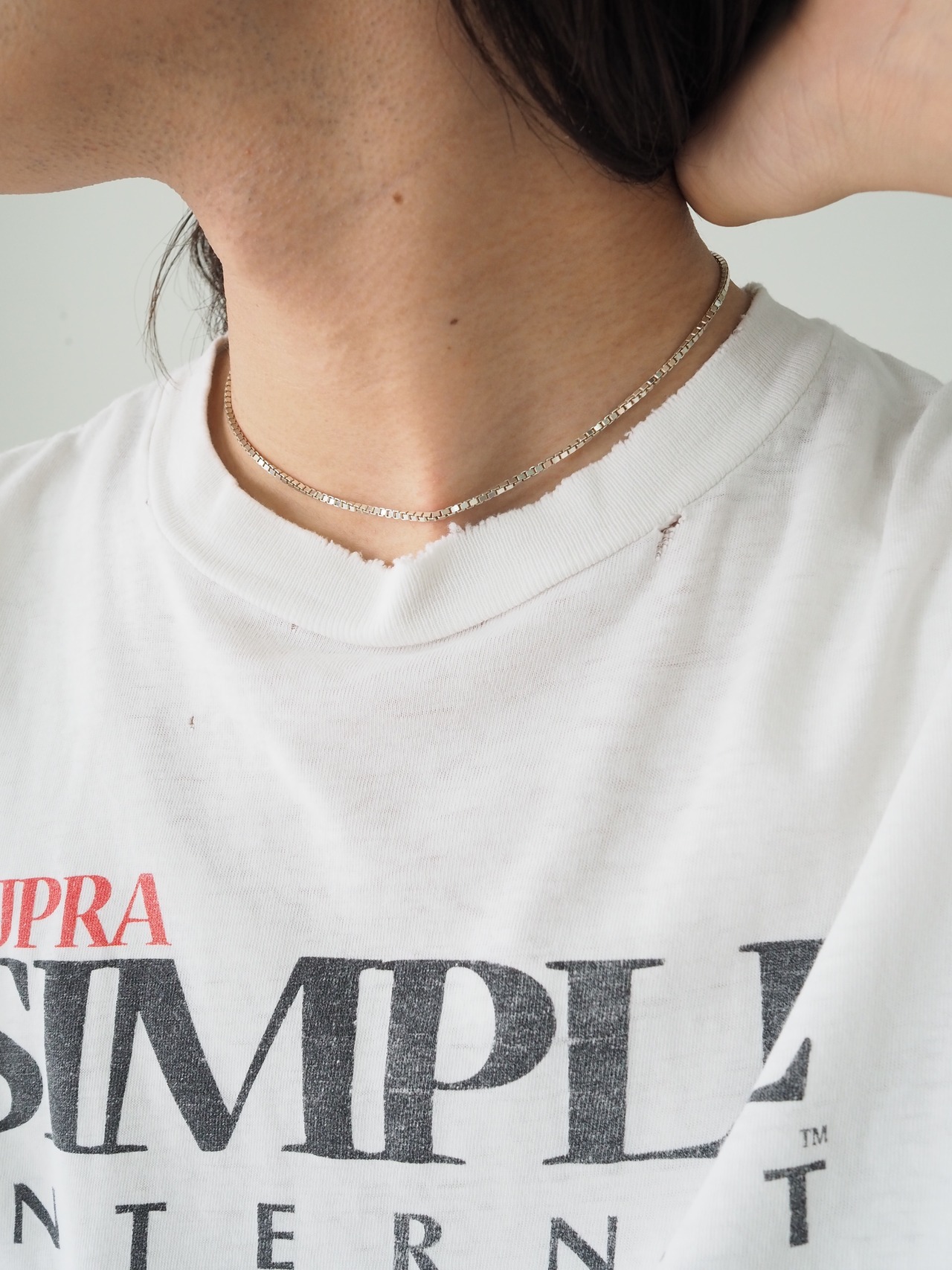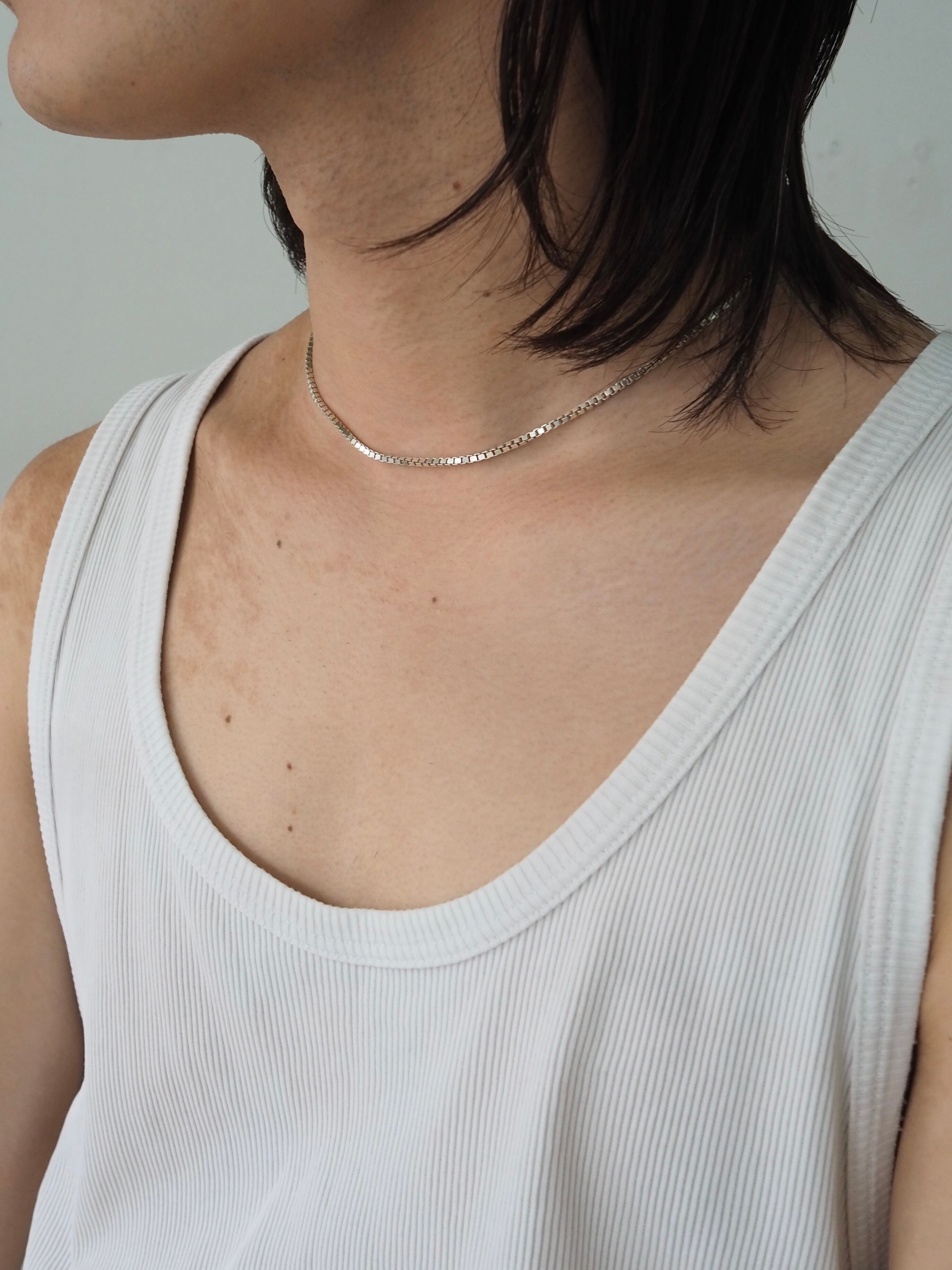 明るいシルバーの色味、華奢ながら存在感とデザイン性を感じるボックスチェーン。