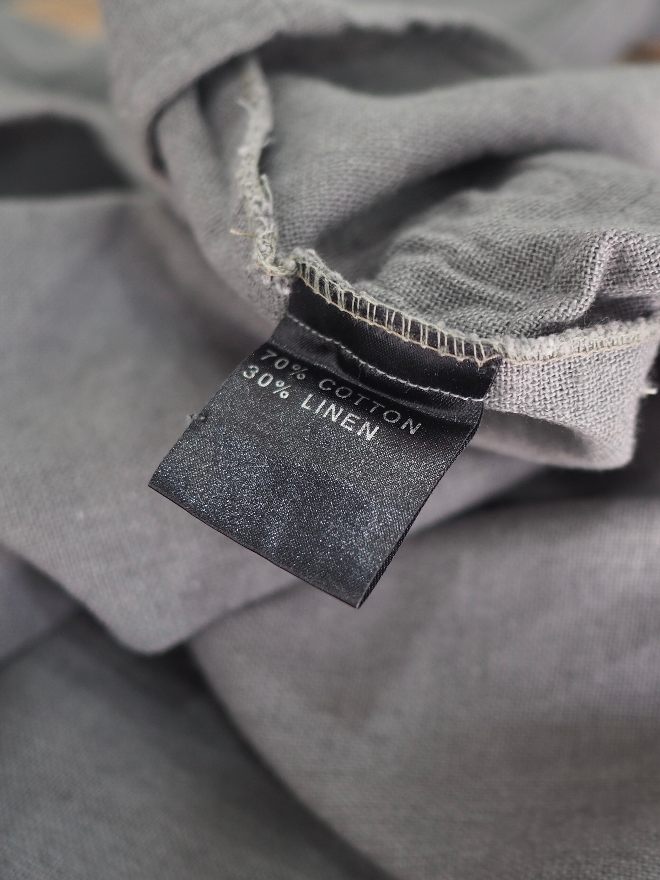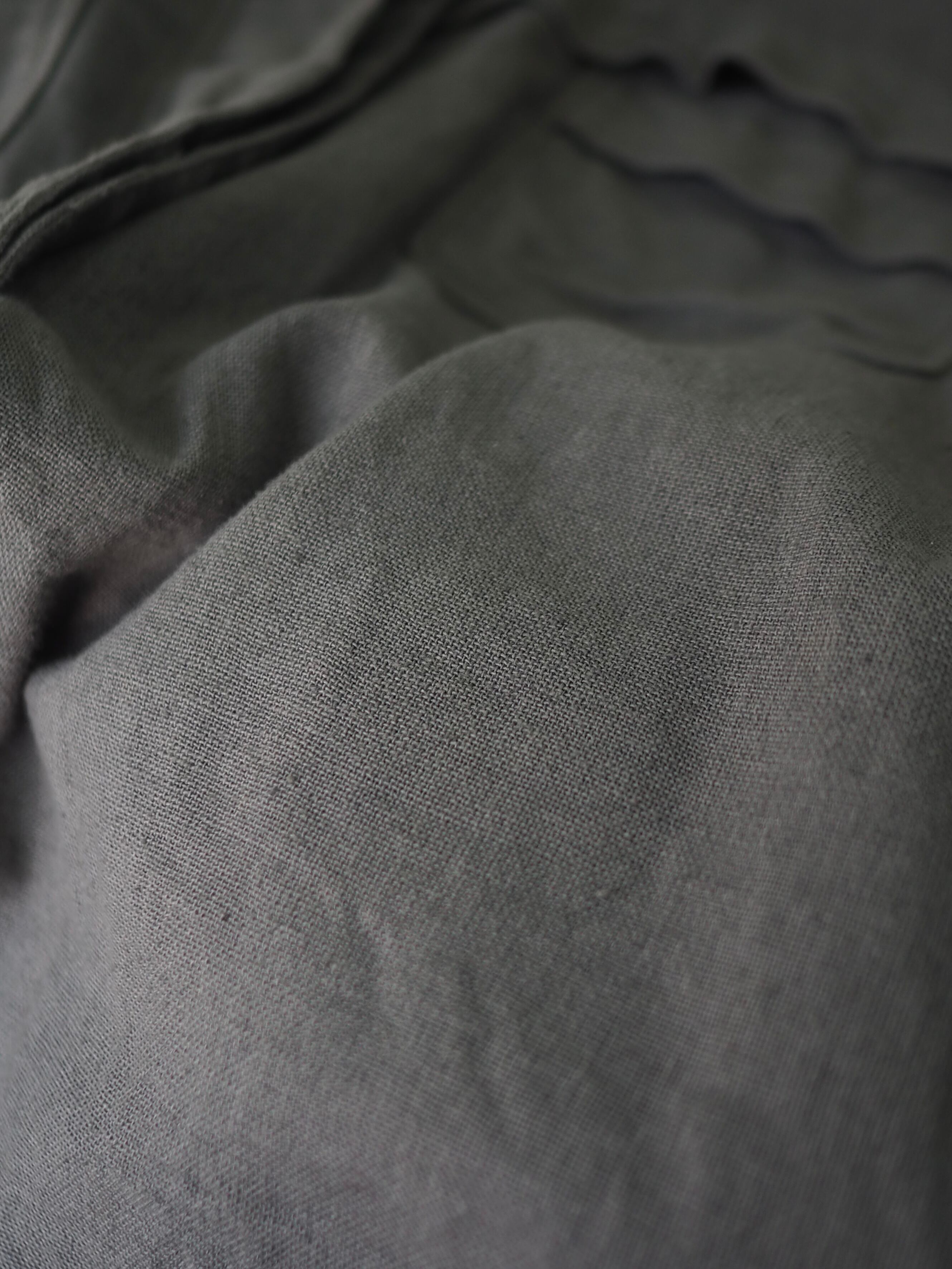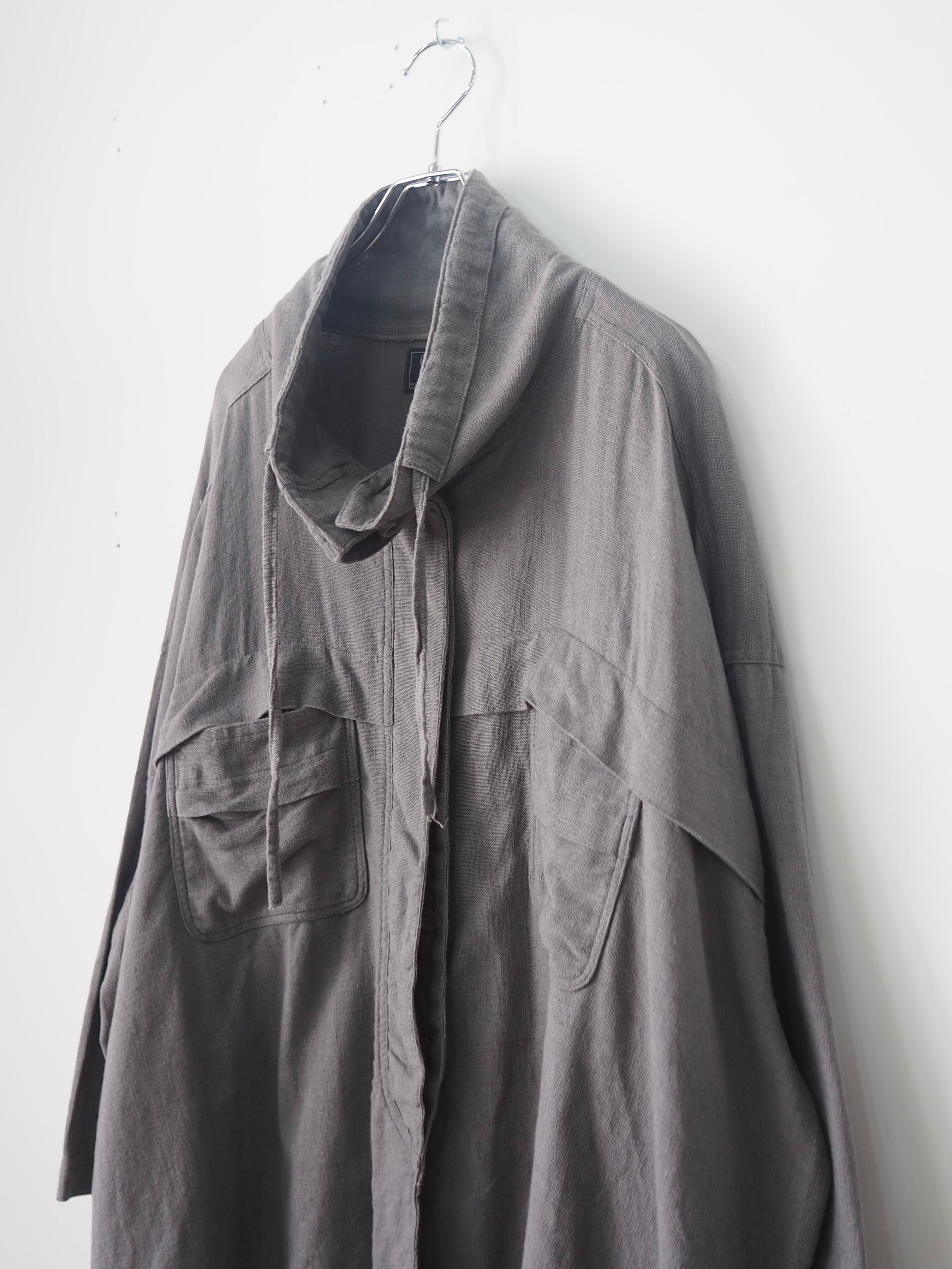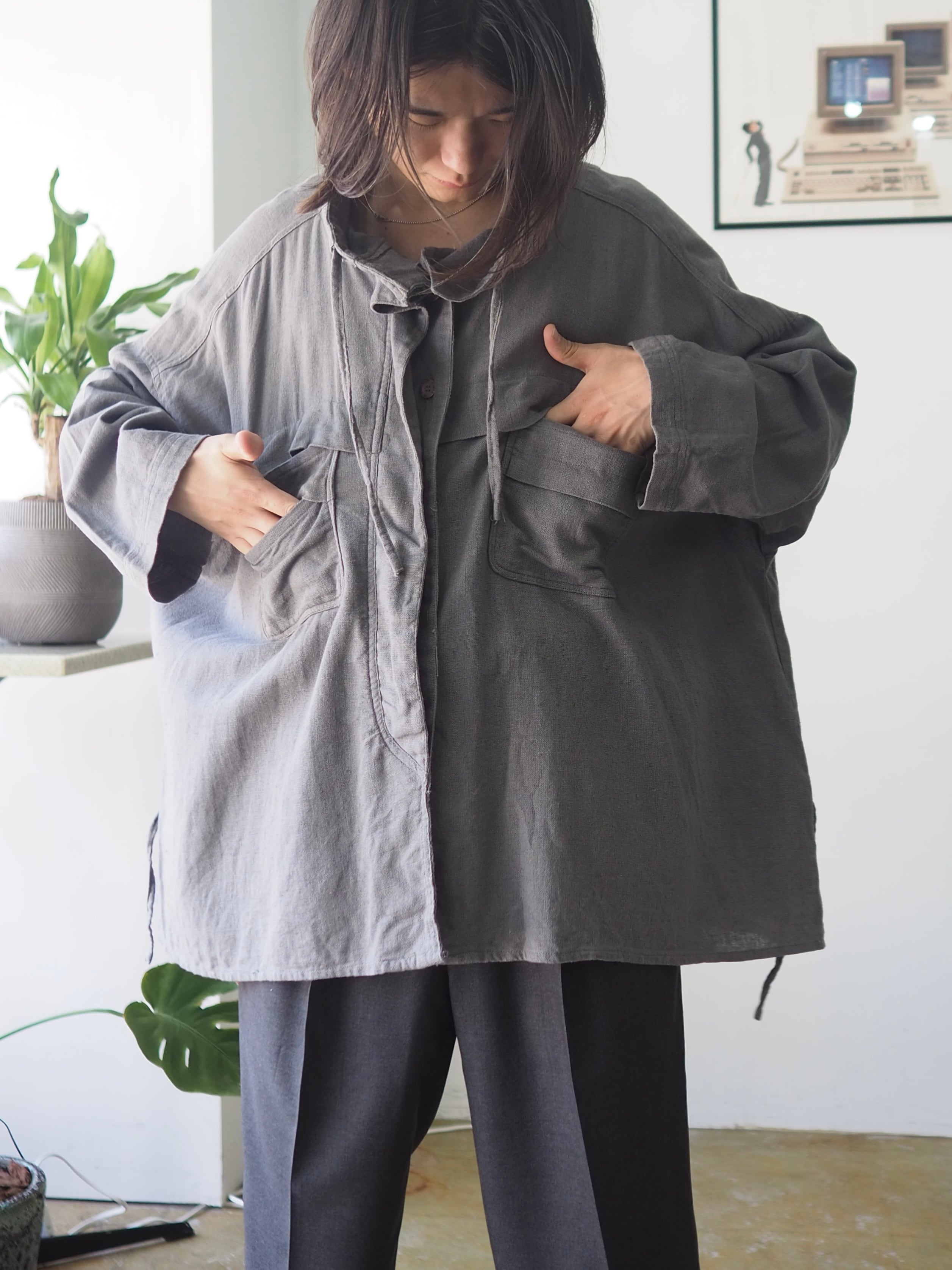 首を包み込むようなゆるいスタンドネックでフロントはボタンアップ。