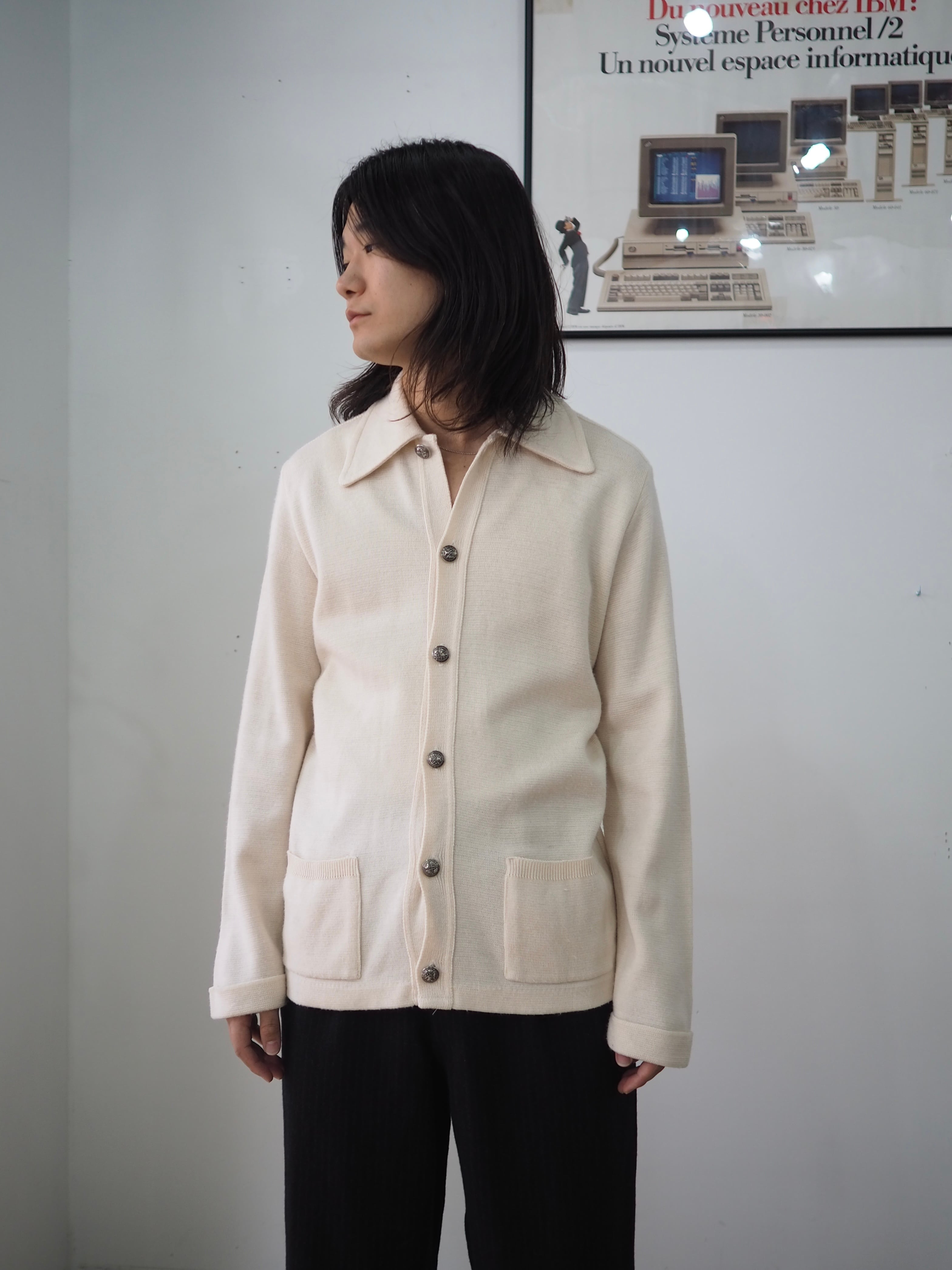 ウールメインのハイゲージニットに70年代らしい大きめの襟、カバーオールのようなパッチポケット。