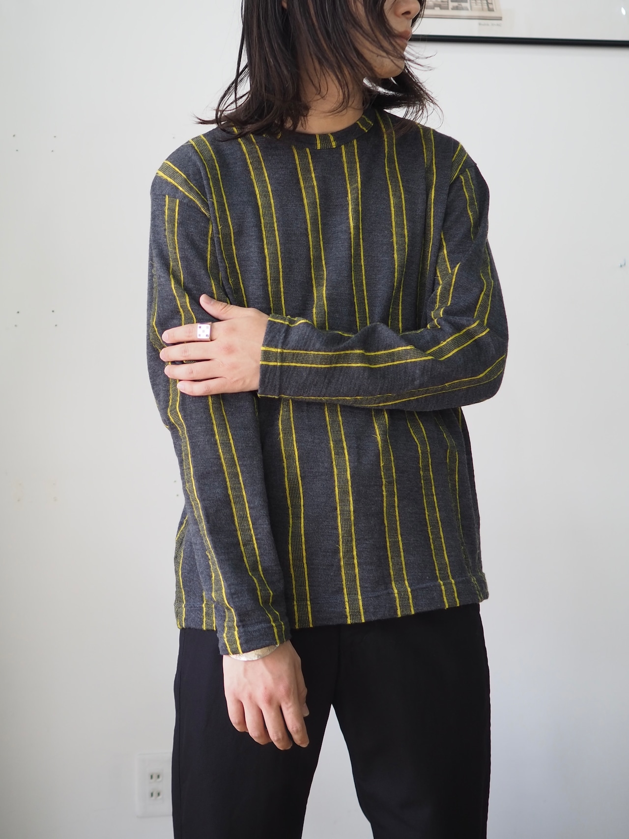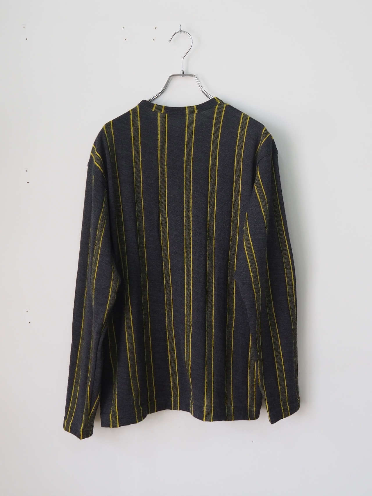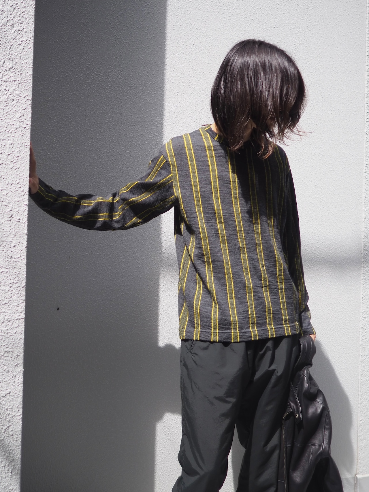 チャコールグレーをベースに映えるイエローのストライプ。