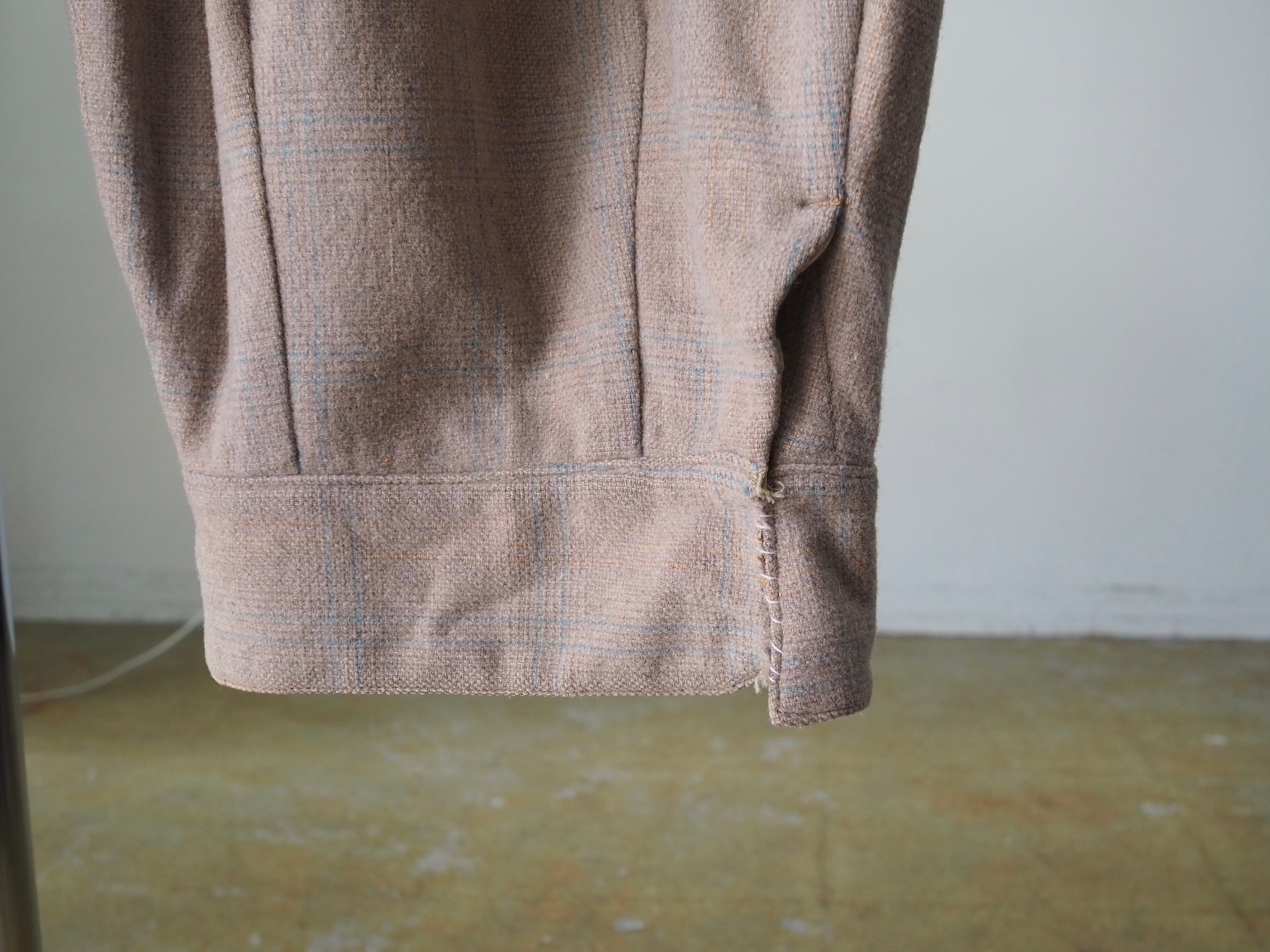 淡いピンクベージュの様な色味に薄っすらブルーのチェックが入るウール地。