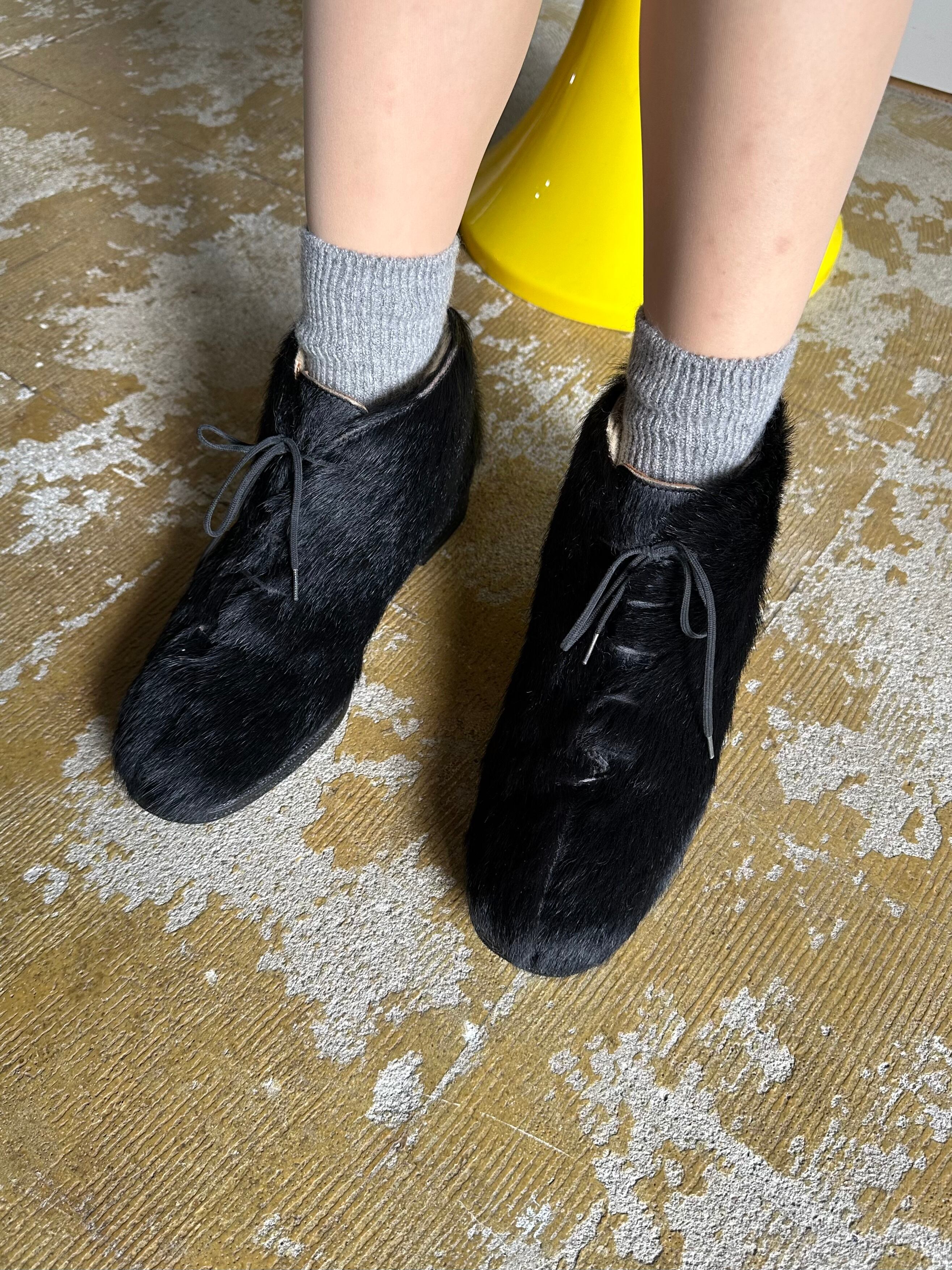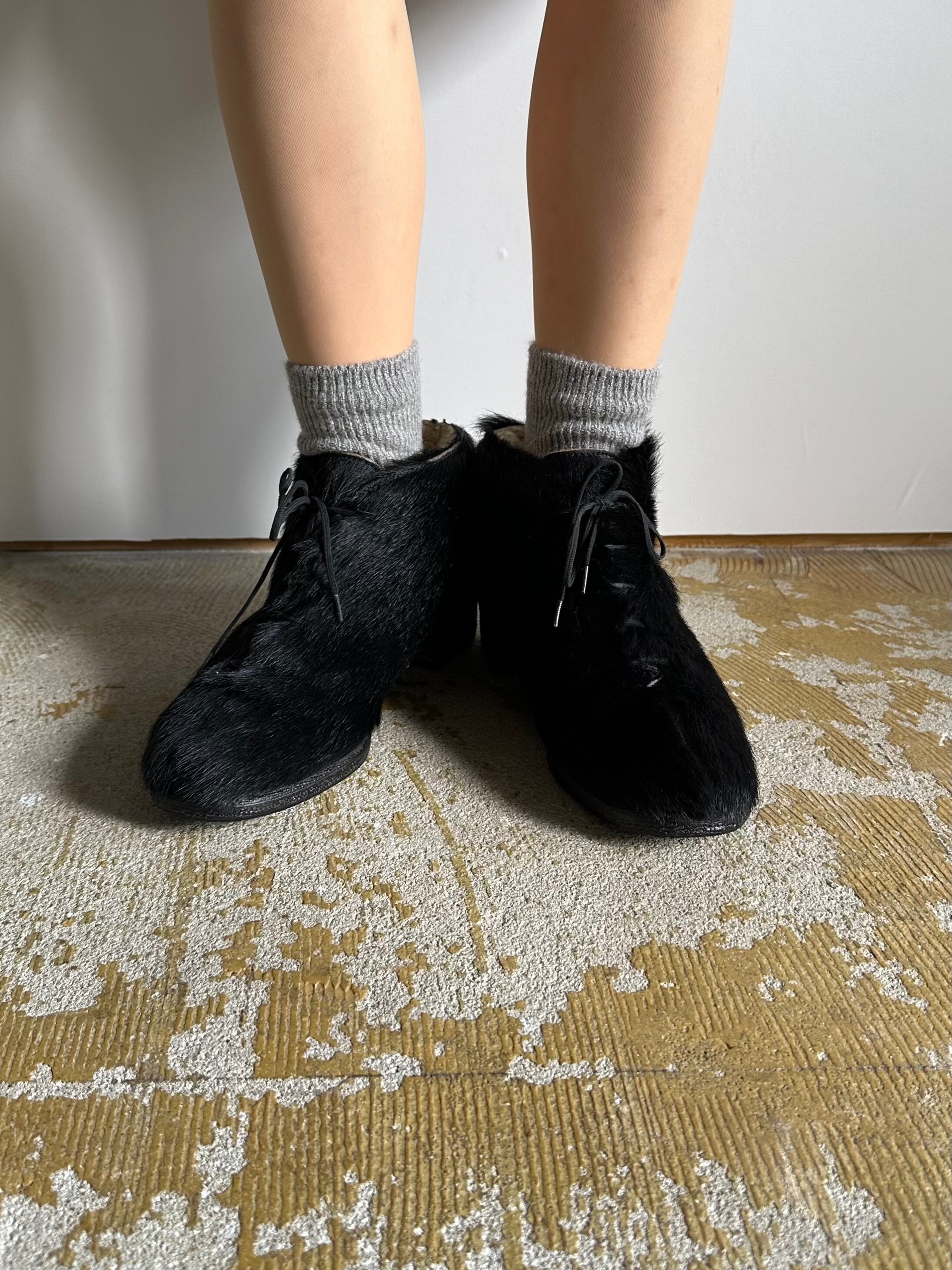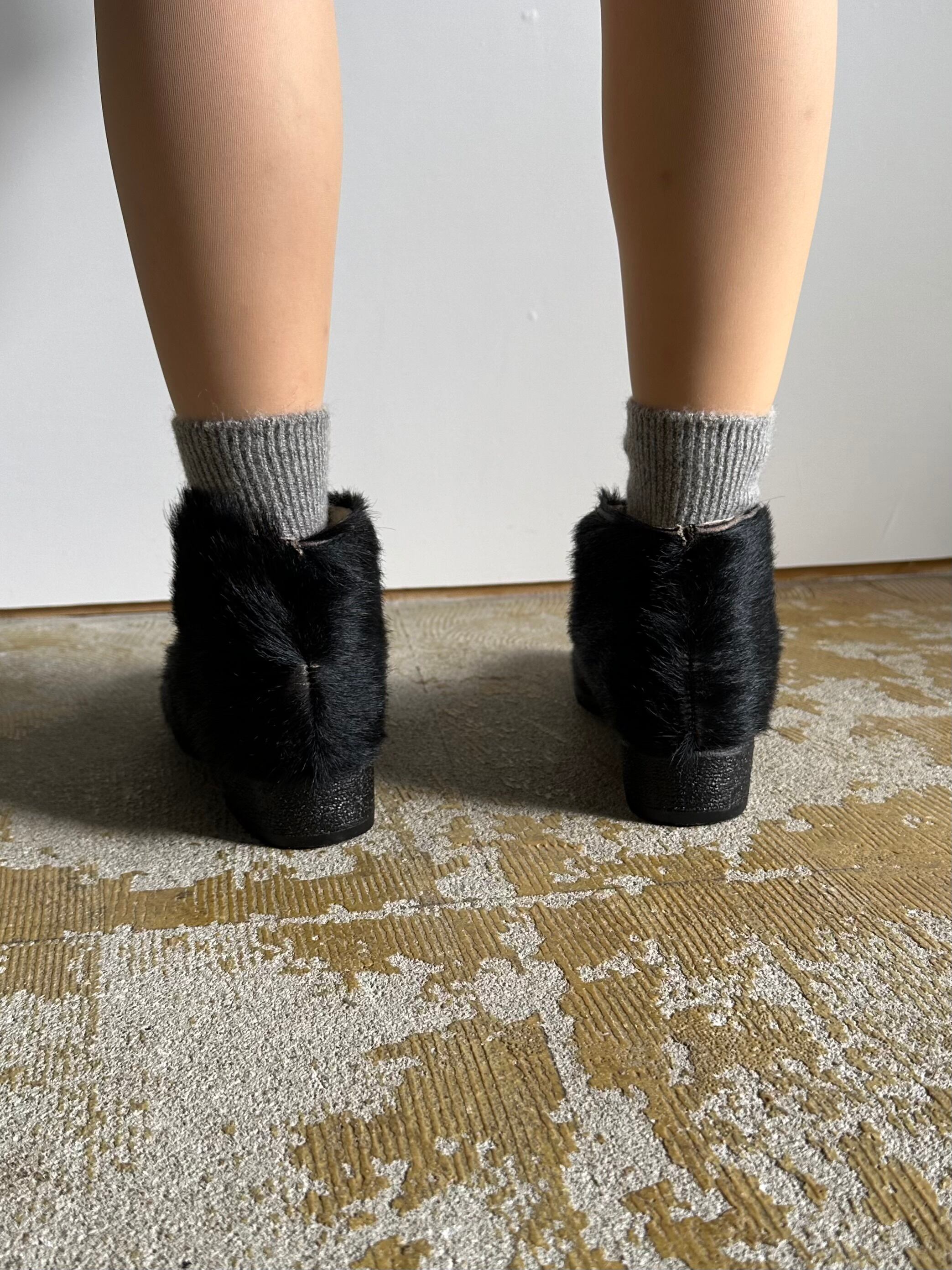 ふさふさとした毛足のあるアッパーにはおそらくアザラシの毛皮が使用され、内側の履き口にはムートンが貼られています。
