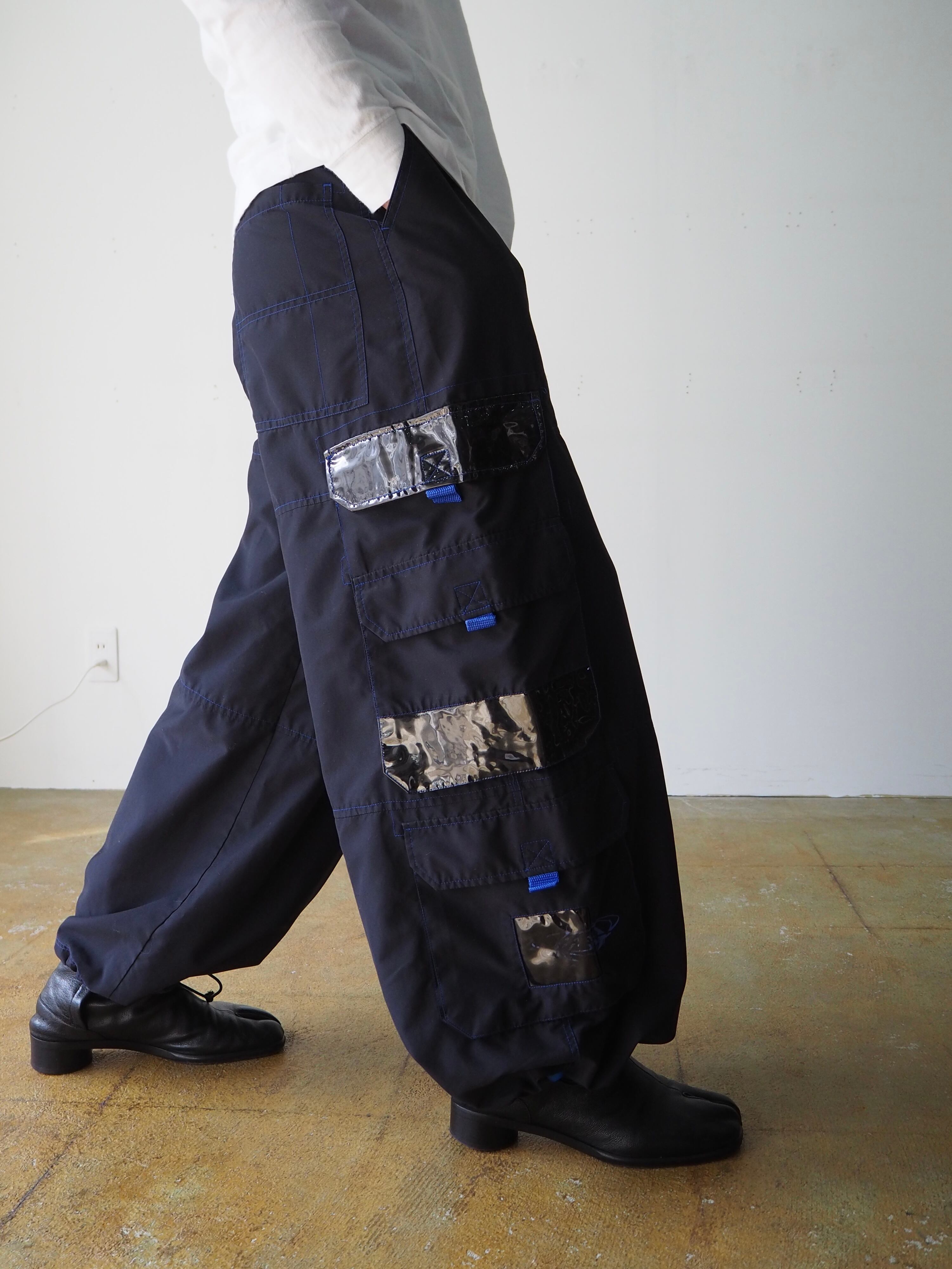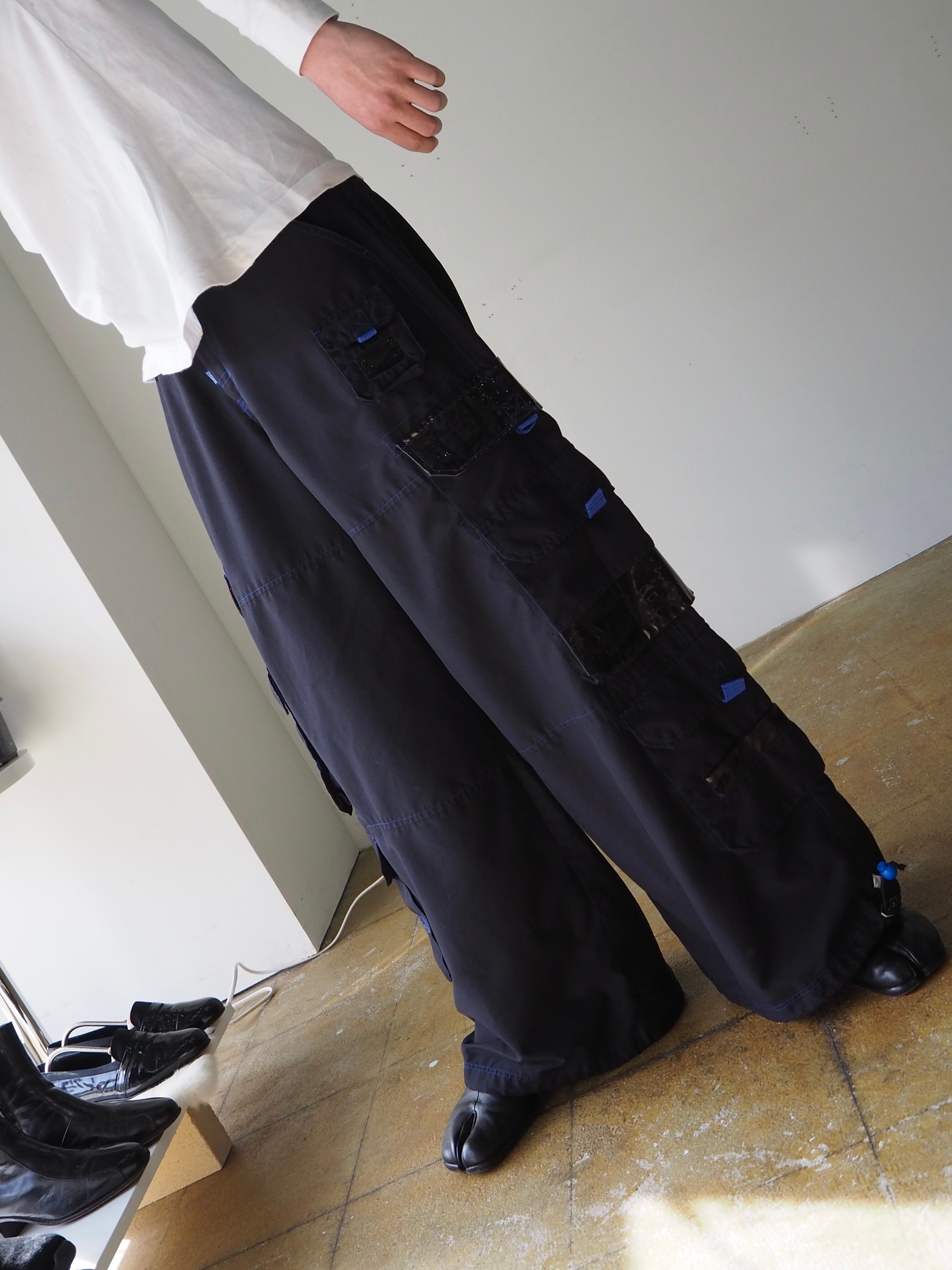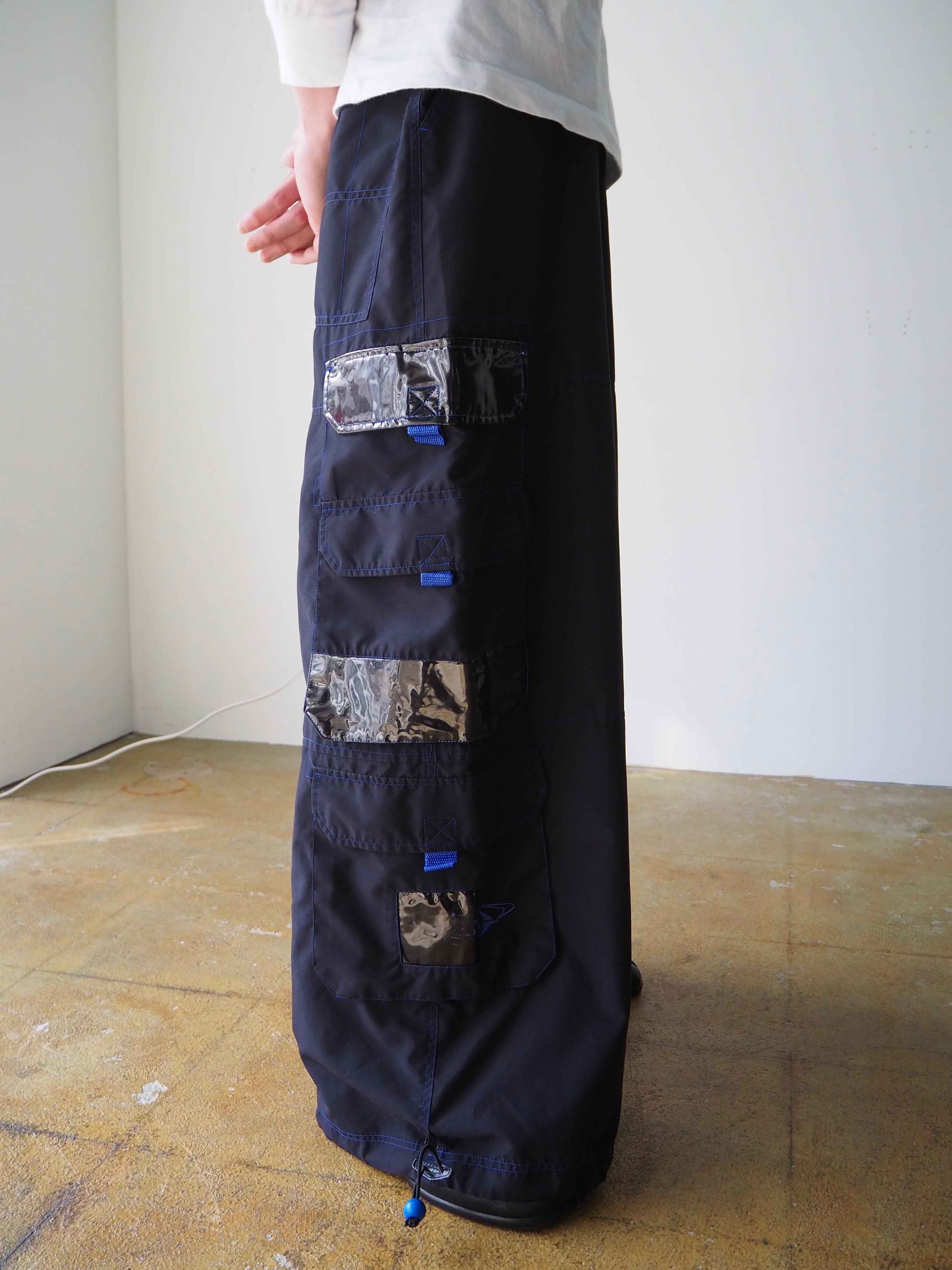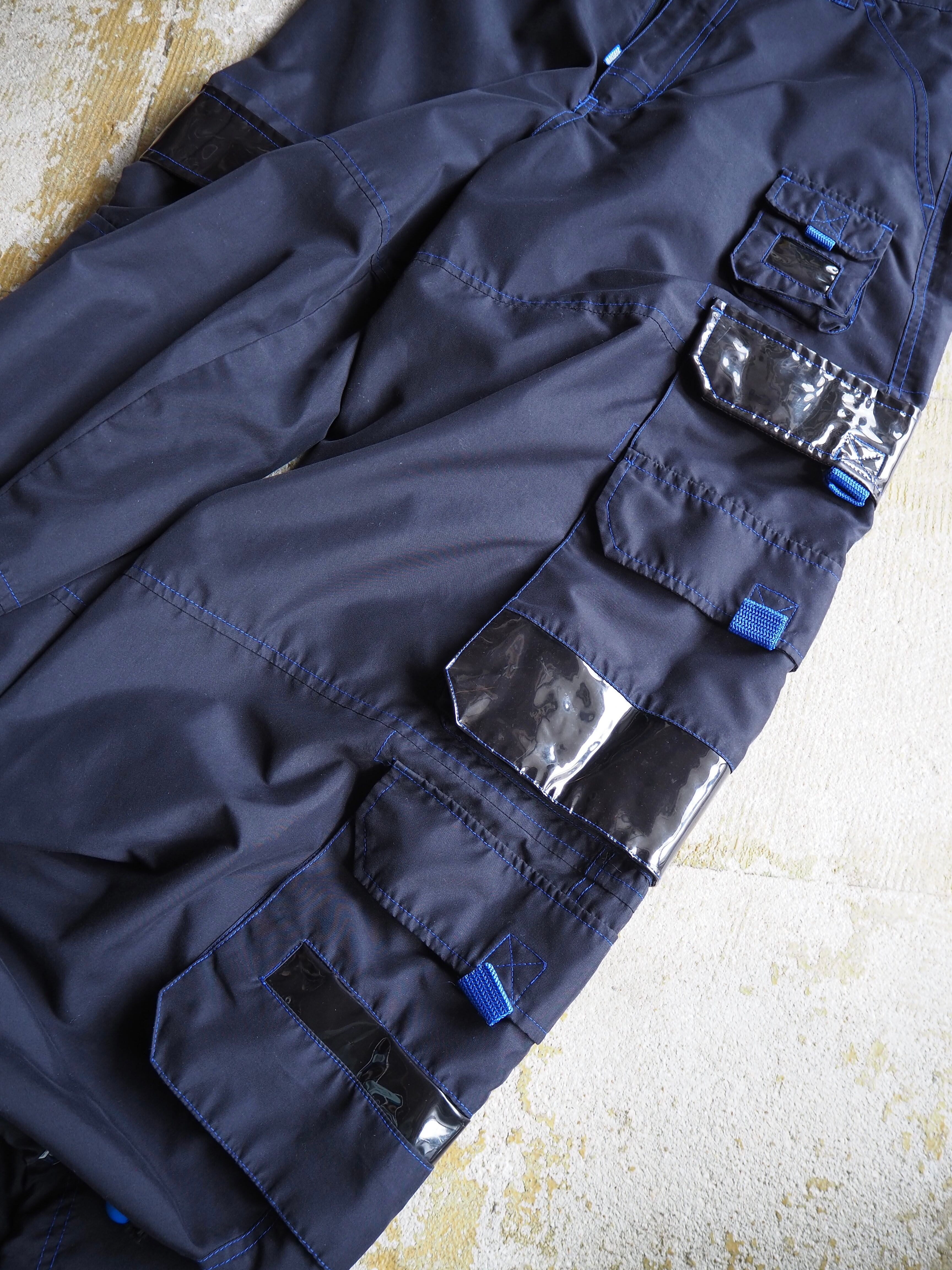 ブラックベースにブルーのステッチが映え、縦に何段も付くカーゴポケットはビニール素材の切り替えが施されています。