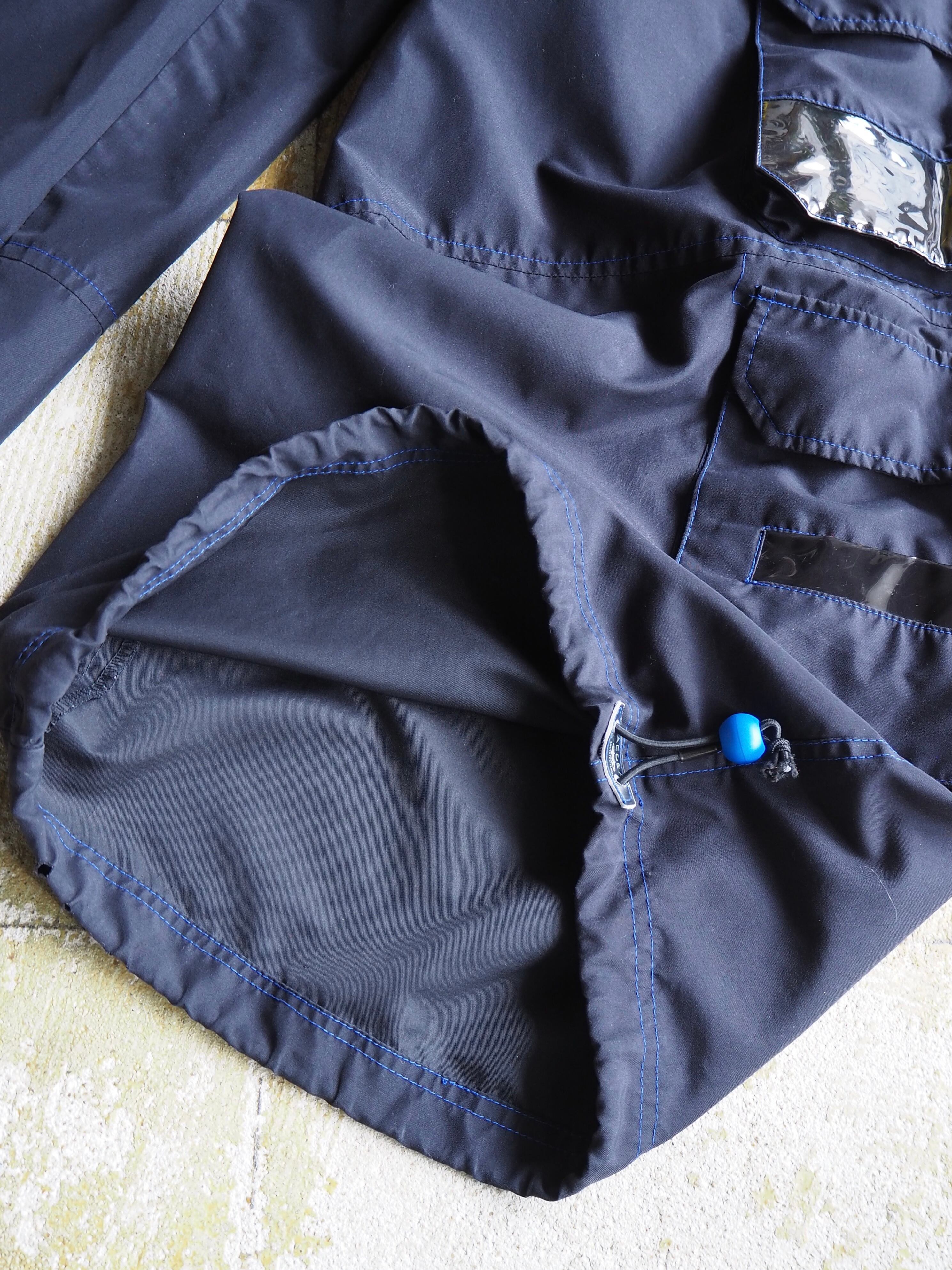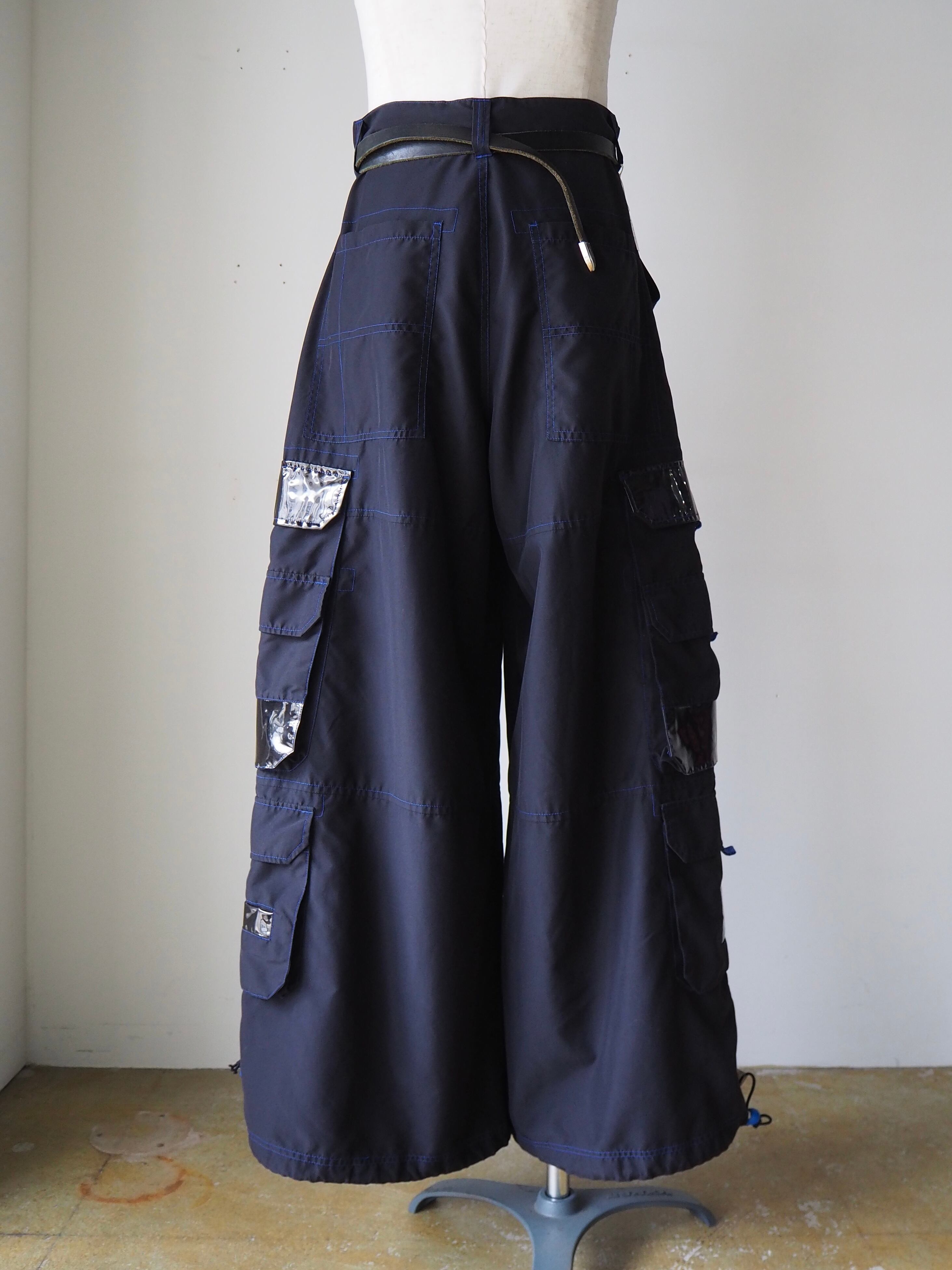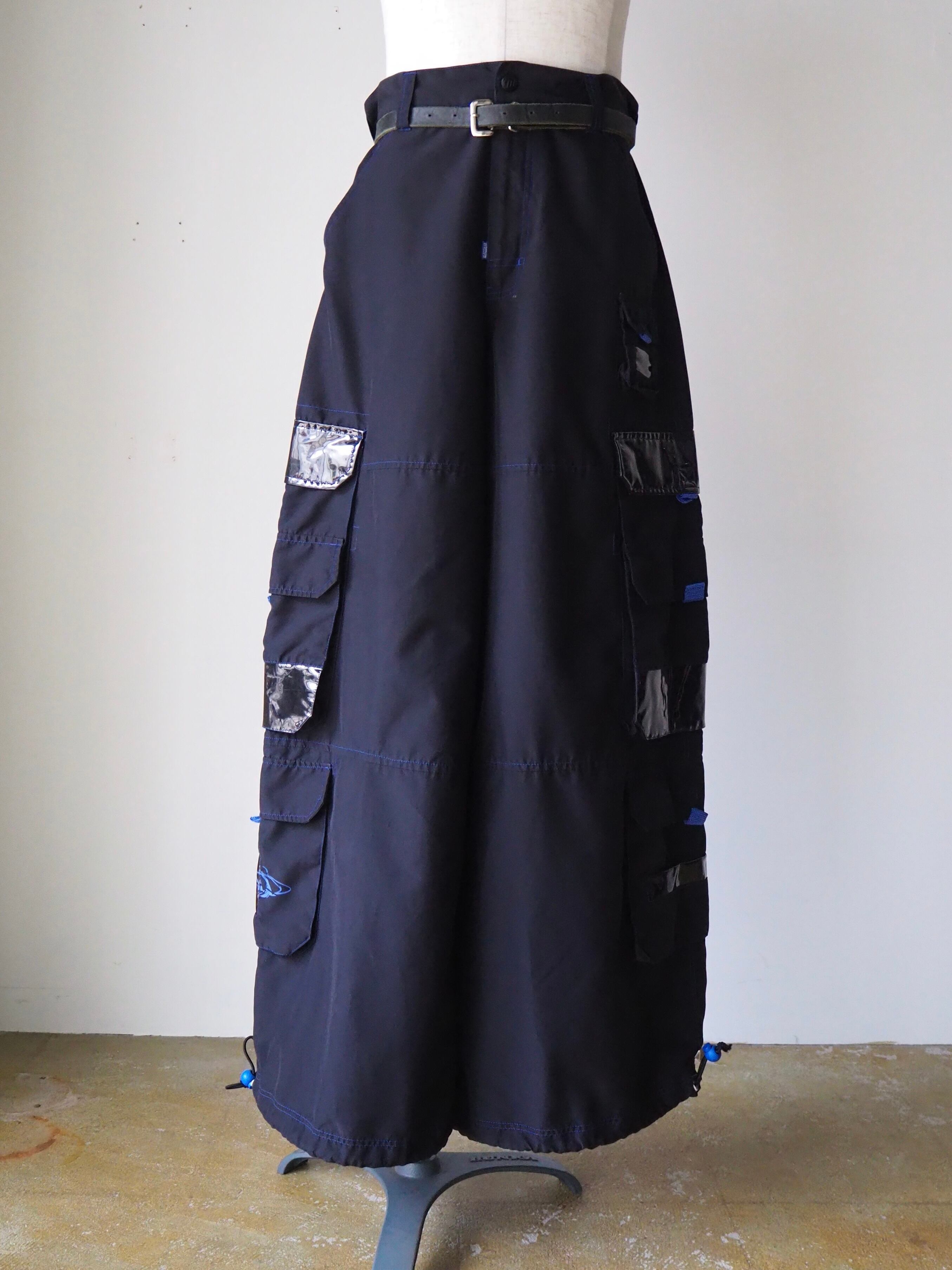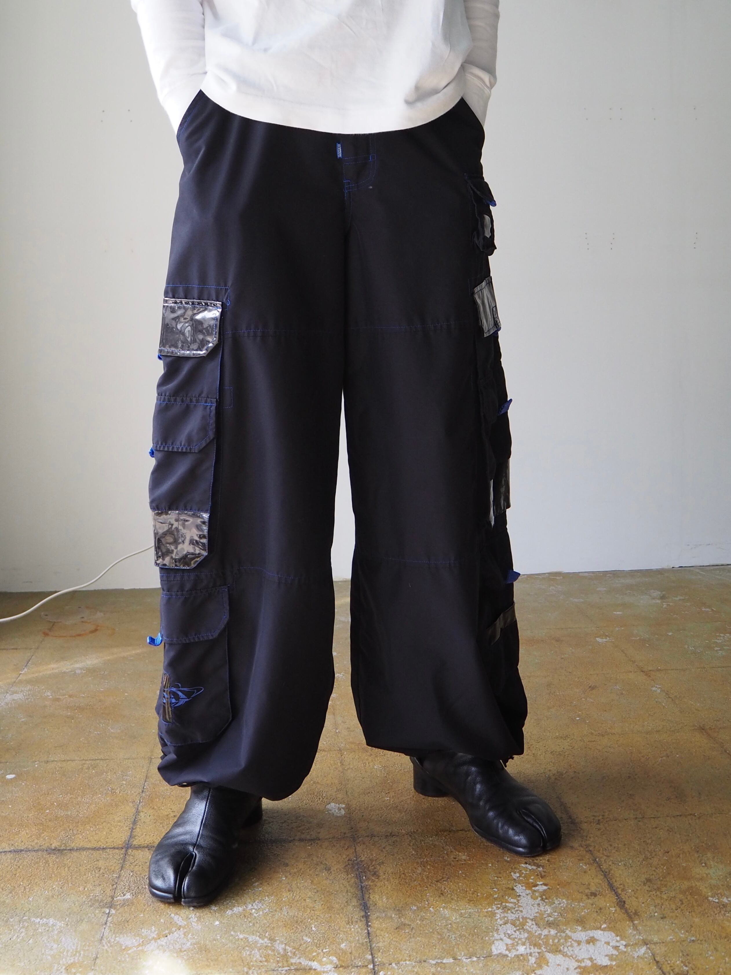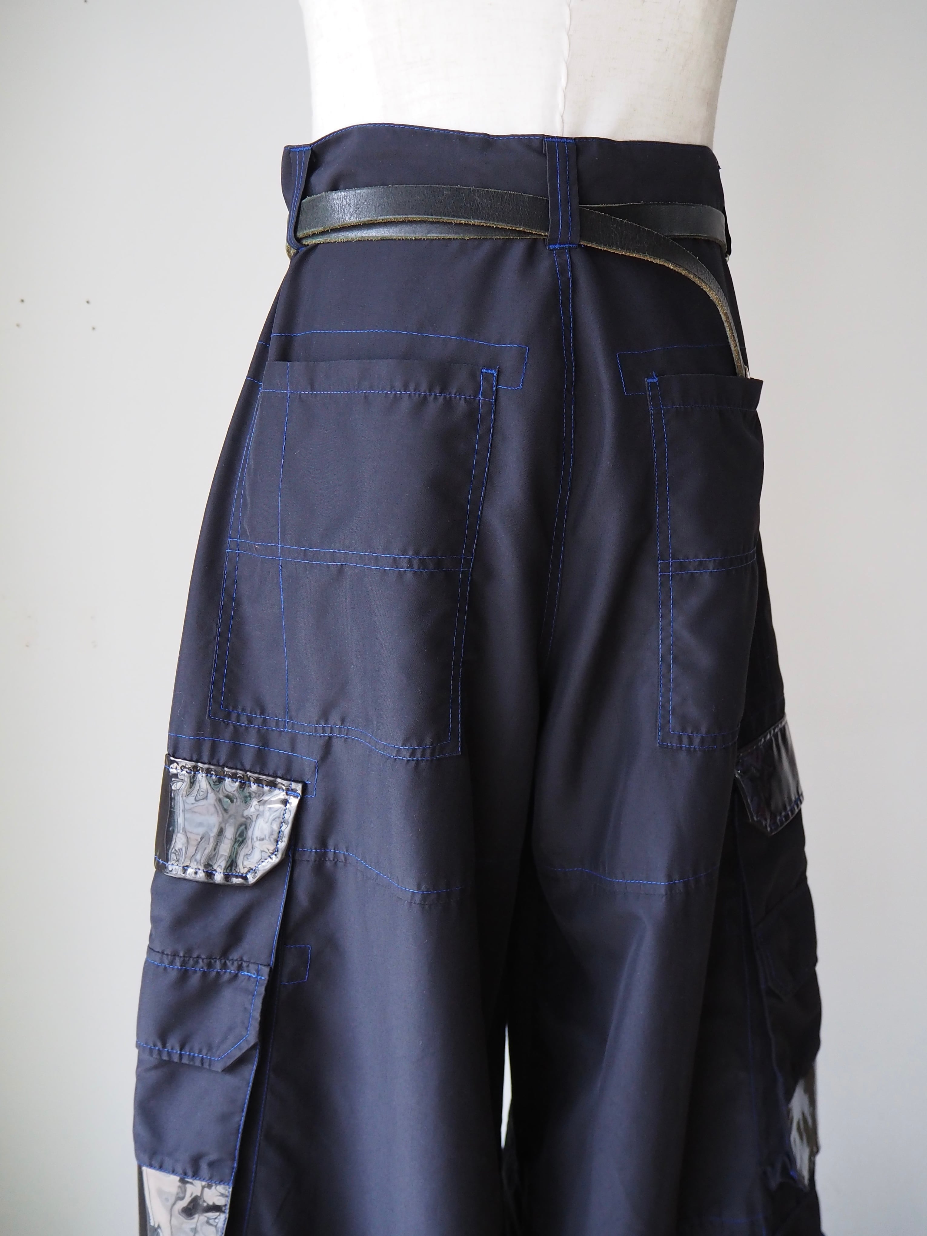ブラックベースにブルーのステッチが映え、縦に何段も付くカーゴポケットはビニール素材の切り替えが施されています。