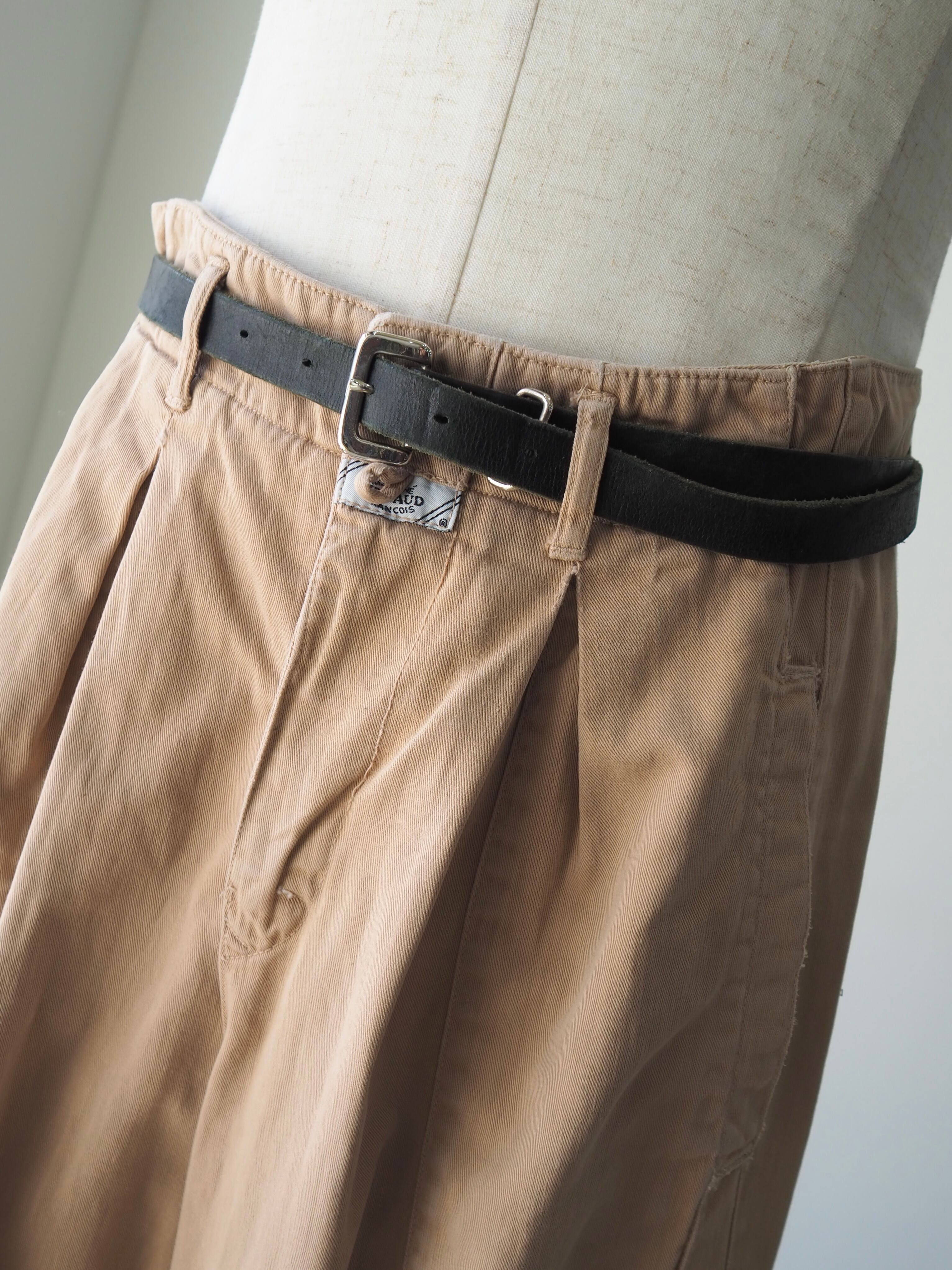 特徴的なタックの入り方とサイドライン風の同生地切り替え。